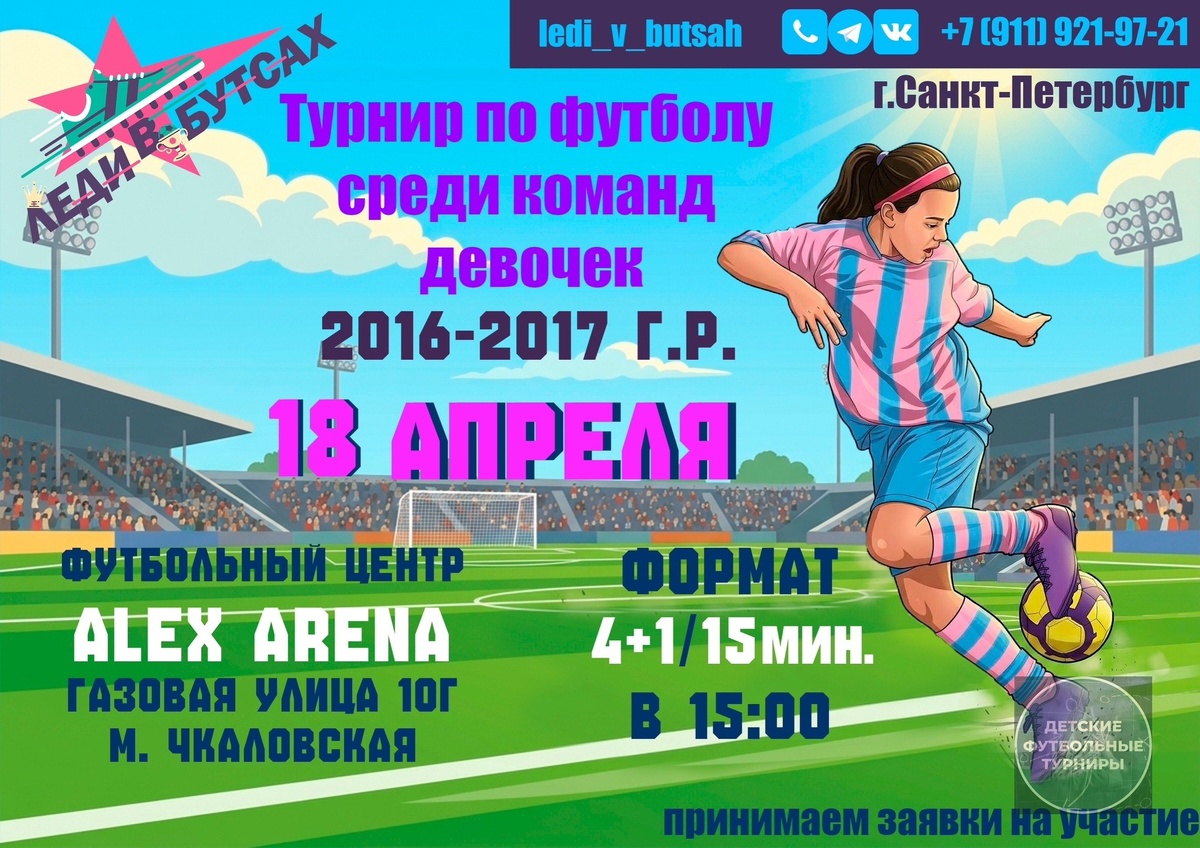 ⚽️🔥 🤩Турнир по футболу среди команд девочек 2016–2017 г. р. — ждём вас в выходные!🤩 🤩Дата: 18 апреля (выходные!) Начало:15:00 📎Место: футбольный центр ALEX ARENA (Газовая улица, 10Г, м. Чкаловская), г. Санкт-Петербург. ⚽ Формат игры: 4+1, длительность матча — 15 минут. 🤩Это отличная возможность для юных футболисток проявить себя, посоревноваться и зарядиться позитивной энергией! 🤙Принимаем заявки на участие! Для записи и уточнений звоните: +7 (911) 921-97-21 🎉Давайте сделаем этот турнир ярким и запоминающимся! Ждём ваши команды! --- #ФутбольныйТурнирАпрель2026 #ФутбольныйТурнирСевероЗапад2026 #ФутбольныйТурнирСанктПетербург2026 #ФутбольныйТурнирДевочкиСпб2016гр #ФутбольныйТурнирДевочкиСпб2017гр Источник: https://vk.com/wall-229929744_1126