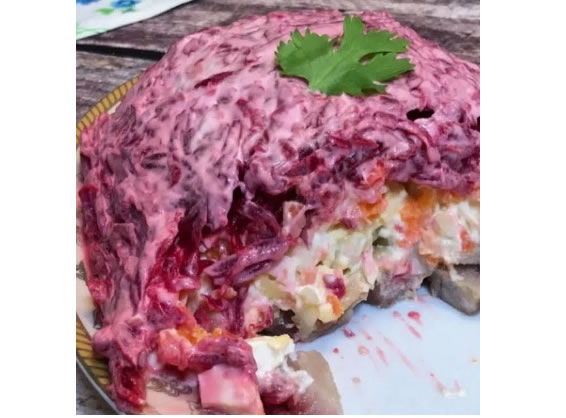 Салат «Оливье» под шубой - это вариант традиционного салата «Оливье», где ингредиенты выкладываются слоями, промазываясь майонезом. Название «под шубой» - метафора: салат находится как бы под «покрывалом» из слоёв овощей, укрывающих его, словно шуба.