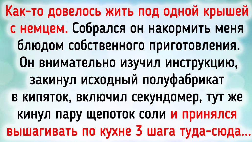 Как-то довелось жить под одной крышей с немцем. Собрался он накормить меня блюдом собственного приготовления. Он очень внимательно изучил инструкцию, закинул исходный полуфабрикат в кипяток, включил секундомер, кинул пару щепоток соли и принялся вышагивать по кухне три шага туда-сюда. Ровно через 7 минут он извлек содержимое из кастрюльки, произвел опять же четко по инструкции все необходимые действия, и... Граждане, таких вкусных спагетти я не ел никогда в жизни! А ведь говорили: если что-то не получается, попробуйте прочесть инструкцию! © kiyasko72 / Pikabu