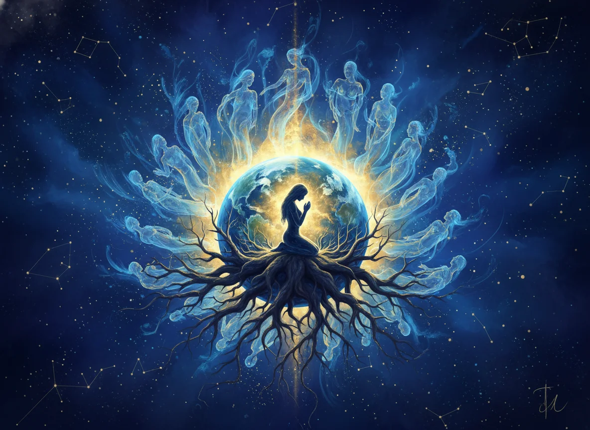 Это не космос. Это пространство, сотканное из душ всех когда-либо живших на земле людей. Каждый человек при жизни — как клетка в огромном организме. Его мысли, чувства, поступки не исчезают бесследно. Они вплетаются в общее духовное поле. А после смерти душа не «улетает» в неведомые дали, не проходит индивидуального суда или чистилища. Она возвращается в это общее поле, становится его неотъемлемой частью, принося туда свой опыт, свою любовь, свои ошибки.