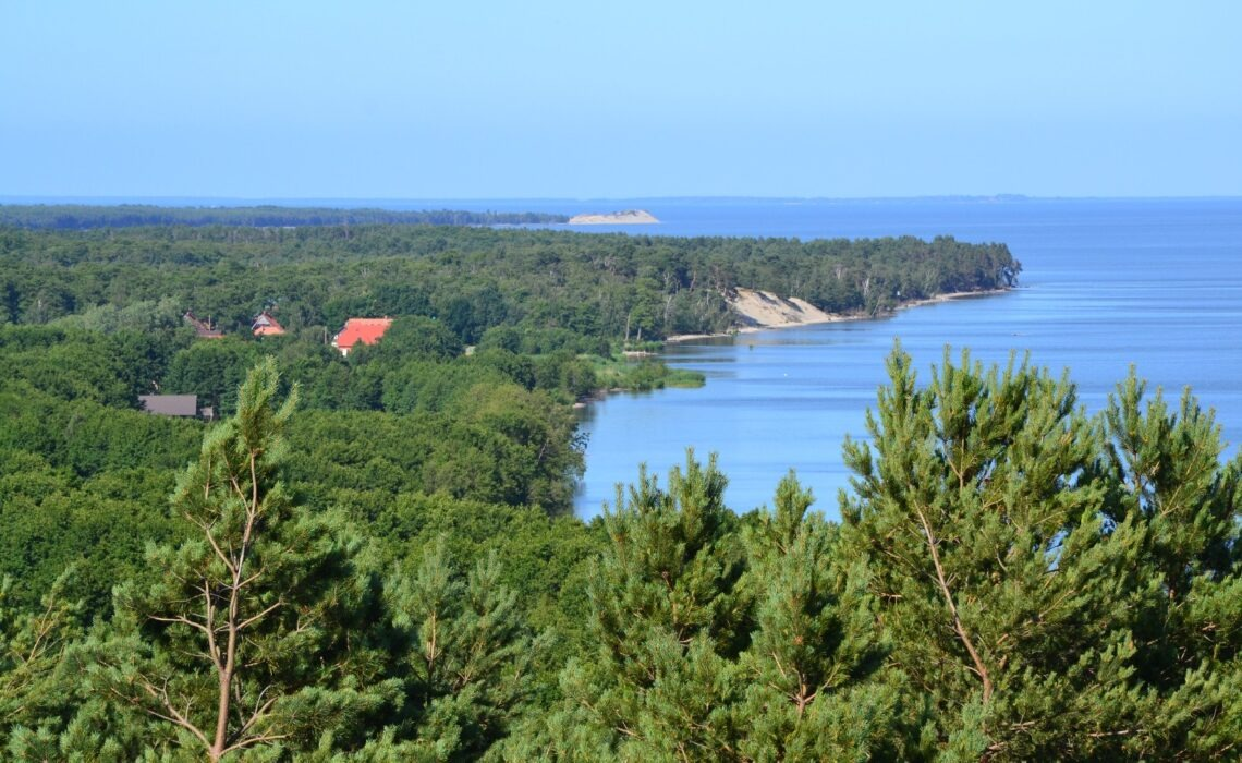 - С другой — на зеркальную гладь Куршского залива, изумрудные леса и крыши поселка Морское.