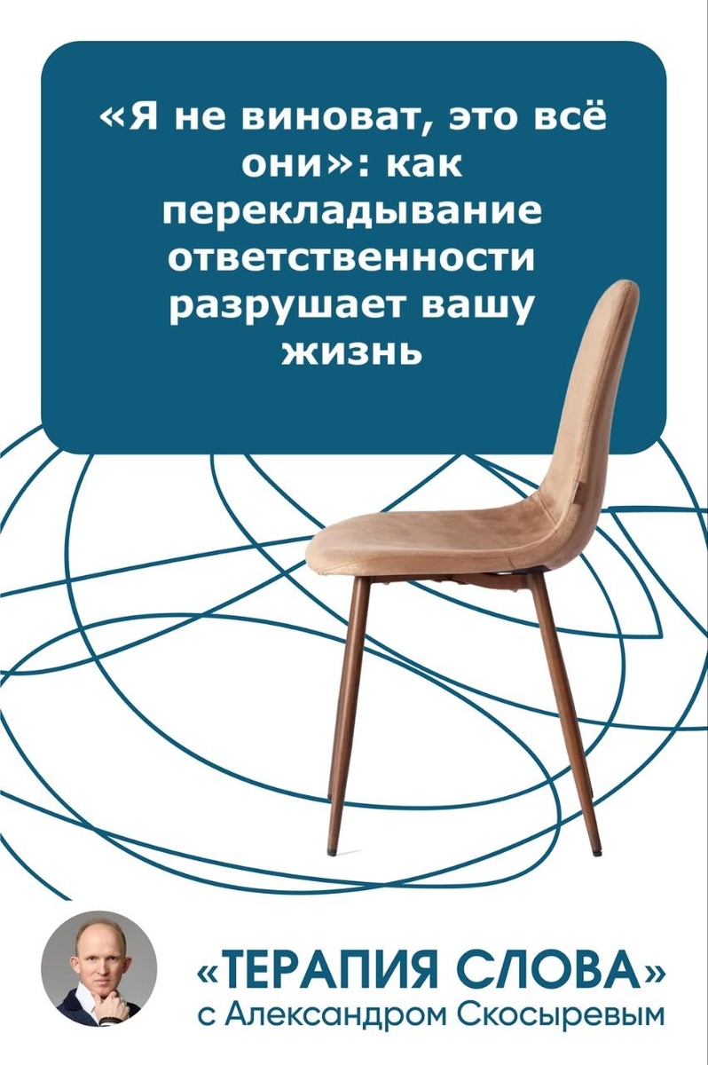 Знакомо? «Меня не повышают, потому что начальник дурак». «Я не худею, потому что муж вечно приносит вкусняшки». «У меня нет денег, потому что государство всё забрало». «Я несчастлив, потому что родители меня не любили». У вас есть целый список тех, кто виноват в том, что ваша жизнь сложилась не так, как хотелось? И вы, кажется, даже готовы этот список зачитать перед комиссией. С доказательствами, фактами и многолетними обидами. Только есть одна маленькая проблема: пока вы будете искать виноватых, ваша жизнь будет стоять на месте. 🎭 Кто в ответе за мою жизнь? (спойлер: не они) Давайте сразу договоримся. Я не говорю, что другие не могут влиять на вашу жизнь. Могут. И сильно. Начальник может быть несправедлив. Партнёр может предать. Родители могут не дать того, что нужно. Обстоятельства могут сложиться не в вашу пользу. Всё это - правда. Но есть одна вещь, которую вы не можете переложить ни на кого: ваш выбор, как на это реагировать. И вот тут начинается главное различие