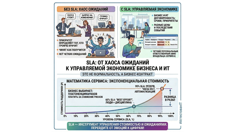 Когда в компании нет SLA, поддержка почти всегда выглядит для бизнеса одинаково: чинят как получится, а приоритеты определяет тот, кто громче кричит. Снаружи это похоже на проблему ИТ. На практике это проблема управления. SLA - это не формальность и не бумага для аудитора. Это договоренность бизнеса и ИТ о том, что считать критичной проблемой, за сколько нужно отреагировать, за сколько решить, в какие часы работает поддержка, какие есть исключения и кто персонально отвечает за сервис. В рабочем SLA обычно фиксируются измеряемые показатели, матрица приоритетов, сроки по разным сервисам, расписание поддержки, владелец сервиса и ФИО ответственного. Примеры того, как это выглядит на практике, лучше показать на скриншотах к статье. Для бизнеса смысл SLA очень простой: это способ перестать покупать «поддержку вообще» и начать покупать понятный уровень сервиса. Потому что неработающая касса в магазине, проблема у одного офисного сотрудника и запрос на небольшое изменение - это три разных по