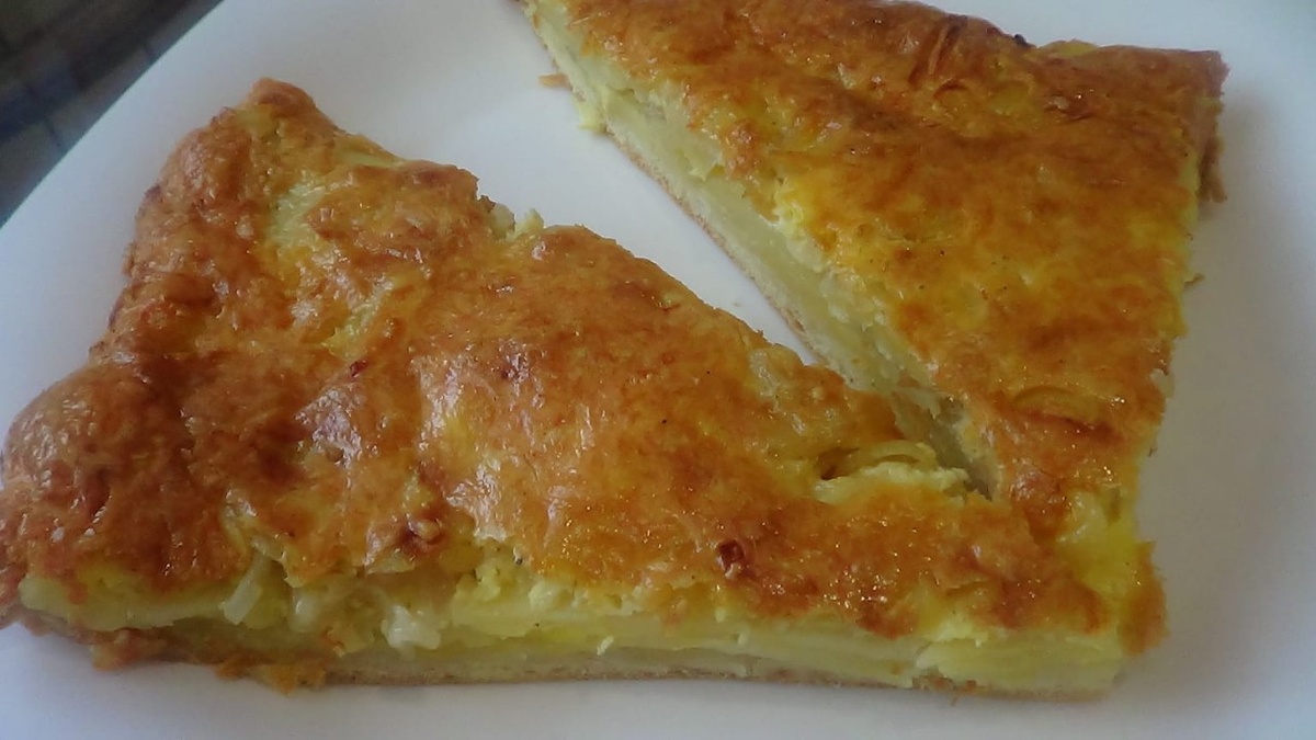 Через час тесто поднялось, начинаем формировать пирог. Берём тесто, нужно раскатать его в тонкий пласт толщиной 0,5 см по размеру противня. Сверху выкладываем картофель тонким слоем. Картофель сверху смазываем майонезом, затем выкладываем жареный лук и распределяем тонким слоем заливку. Пирог отправляем в духовку разогретую до 180 °C на 25 минут до золотистой корочки. Картофель проверяйте вилкой на готовность. Вкуснющий пирог готов! Всем приятного аппетита!