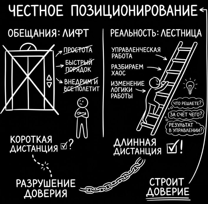 #позиционирование #доверие #управление На рынке очень часто пытаются продать лестницу как лифт. Обещают простоту там, где будет большая управленческая работа. Обещают быстрый порядок там, где сначала придется разбирать хаос. Обещают "сейчас внедрим и все полетит" там, где компании еще нужно менять логику работы. На короткой дистанции это может даже сработать. Но на длинной дистанции такое позиционирование разрушает доверие. Потому что клиент покупал один сценарий. А получил другой. Именно поэтому сильное позиционирование всегда честное. Если ты даешь инструмент, говори, что это инструмент. Если ты собираешь рабочую систему, говори, что твоя ценность в проектировании, отсечении лишнего, настройке логики и доведении до реального использования. Если ты помогаешь увидеть задачу до внедрения, говори именно это. Рынок устал от красивых обещаний. Особенно управленцы. Им нужен не шум. Им нужен понятный ответ на три вопроса. Что именно вы решаете. За счет чего. И какой результат я смо