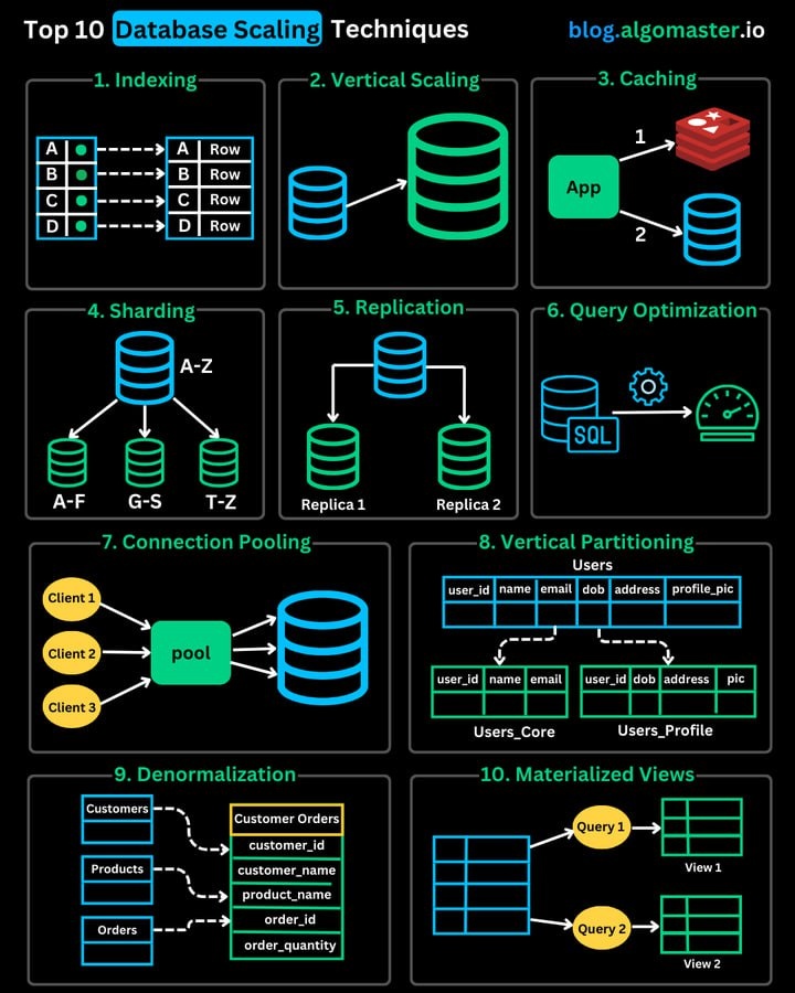 Индексация: Создавайте индексы на часто запрашиваемых столбцах, чтобы ускорить извлечение данных. Вертикальное масштабирование: Увеличивайте мощность базы данных, добавляя больше CPU, оперативной памяти или хранилища, чтобы справляться с повышенной нагрузкой. Кэширование: Храните часто запрашиваемые данные в памяти, чтобы снизить нагрузку на базу данных и улучшить время отклика. Шардинг: Разделяйте данные на независимые фрагменты и распределяйте их между несколькими серверами, что позволяет горизонтально масштабировать базу данных и повышать производительность. Репликация: Создавайте несколько копий базы данных на разных серверах, чтобы распределять запросы на чтение между репликами и повышать доступность. Оптимизация запросов: Улучшайте SQL-запросы, исключайте ресурсоемкие операции и эффективно используйте индексы, чтобы ускорить выполнение запросов и снизить нагрузку на базу данных. Пулинг соединений: Уменьшайте расходы на открытие и закрытие соединений с базой данных, переиспо