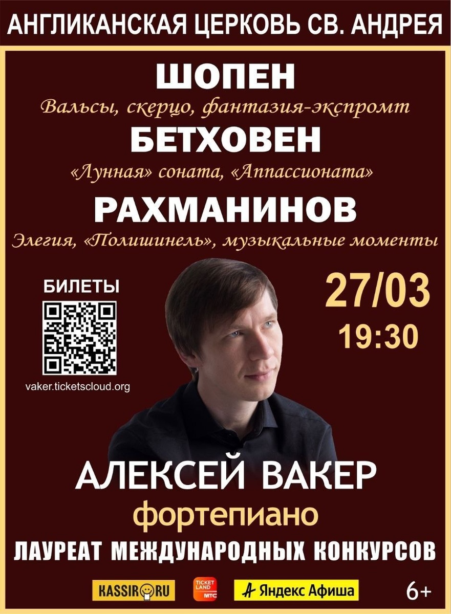 преподавателя РАМ им. Гнесиных - Алексея Вакера. В этот вечер слушатели смогут насладиться гениальными произведениями сразу трех великих композиторов — Бетховена, Шопена и Рахманинова. Место проведения концерта — Англиканская церковь св. Андрея — это не просто здание с богатой историей. Зал старинного собора обладает акустикой филармонического уровня: его стены создают неповторимую атмосферу для прослушивания классической музыки. ✨ ПРОГРАММА КОНЦЕРТА I отделение: Л. ван Бетховен Соната № 14 до-диез минор «Лунная» Соната № 23 фа минор «Аппассионата» II отделение: Ф. Шопен - Вальсы op.64 № 1,2 - Фантазия-экспромт - Скерцо №1 С. Рахманинов - Элегия - "Полишинель" - Муз. моменты op.16 № 2,3,4 🎫 БИЛЕТЫ: https://vaker.ticketscloud.org 🔥 СКИДКА на билеты 20% по ПРОМОКОДУ "ВАКЕР". (от 1200 р.) 📆 27 Марта ⏲ 19:30 📍 Англиканская церковь св. Андрея 📍 Вознесенский пер, 8/5с3