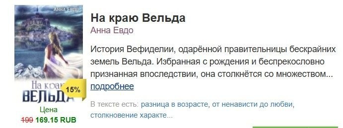 Фэнтези, которое для меня самой более настоящее, чем современная проза. Без оглядки на реверансы, перекошенную толерантность, культ безответственности и человеческого дистанцирования. Вельд не терпит лжи, самовлюблённого эгоизма, бессовестности и равнодушия. Вельд справедлив, даже когда кажется, что нет ) И очень терпелив, особенно к автору. -15% сегодня #на_краю_вельда@anna_evdo30
