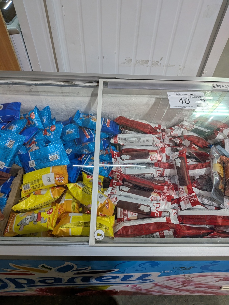 На протяжении долгих лет мы посещали "Светофор", выбирая там неплохие продукты, потому что это было действительно выгодно - все подряд не купишь, хватало и тех товаров, что очевидно не устроят по качеству даже в сравнении с простым супермаркетом, но почти всегда можно было встретить и популярные бренды, и просто нормальные продукты. Только все чаще замечаю один момент: выгода уже не такая очевидная. Что-то по-прежнему стоит заметно меньше, чем в магазинах, которые я посещаю каждый день, но частенько вижу и те ценники, что мне кажутся даже более высокими, т.к. по акции в супермаркете я бы потратила меньше. Вот и стало интересно, кто-то еще замечал такие изменения в "Светофоре" или это тоже специфика севера? Но все же мы приехали сюда за некоторыми покупками, а, значит, буду делиться с вами найденными новинками: Мороженое постоянно покупаем в этом магазине, так что было бы странно пройти мимо, к тому же все холодильники оказались заполненными доверху! И, что любопытно, для меня все эти э