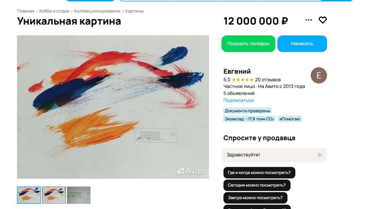 На сайте объявлений появился необычный лот – полотно, авторами которого значатся дельфины Яша и Яна из Карадагского океанариума. Картина датирована 29 июня 2025 года. Продавец называет ее «исключительной работой природы и искусства», где каждая линия отражает дух моря и свободу животных. Ценник в 12 миллионов рублей выглядит контрастно на фоне других предложений. Например, в декабре прошлого года за 120 тысяч рублей можно было приобрести автопортрет Почетного гражданина Воронежа, художника Василия Криворучко. Таким образом, «дельфинья живопись» оказалась дороже работ признанного мастера в 100 раз. Продавец уверяет, что подобные картины набирают популярность у коллекционеров благодаря редкости и эмоциональной насыщенности. Покупателю обещают не просто предмет интерьера, а символ связи человечества с природой.