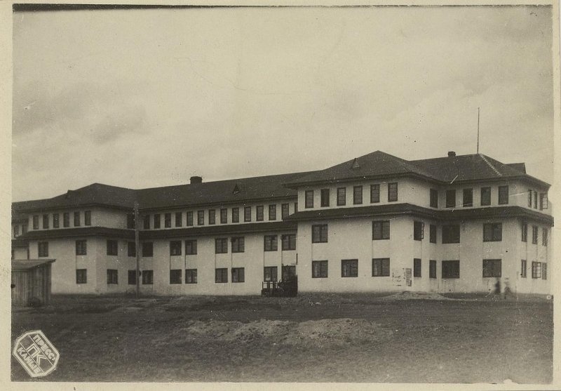 Планировка трёхэтажного здания отличалась ясностью и рациональностью. Протяженный корпус коридорного типа длиной 78,5 и шириной 9,2 метра ориентирован продольной осью по направлению с юго-запада на северо-восток. Юго-западный торец здания заканчивался поперечным блоком с размерами в плане 9,6×22,5 м. В зальных помещениях этой части здания на первом этаже размещалась школа (с 6 по 10 класс), а на втором этаже – библиотека. В противоположном торце здания находилась столовая с кухней и обеденным залом.