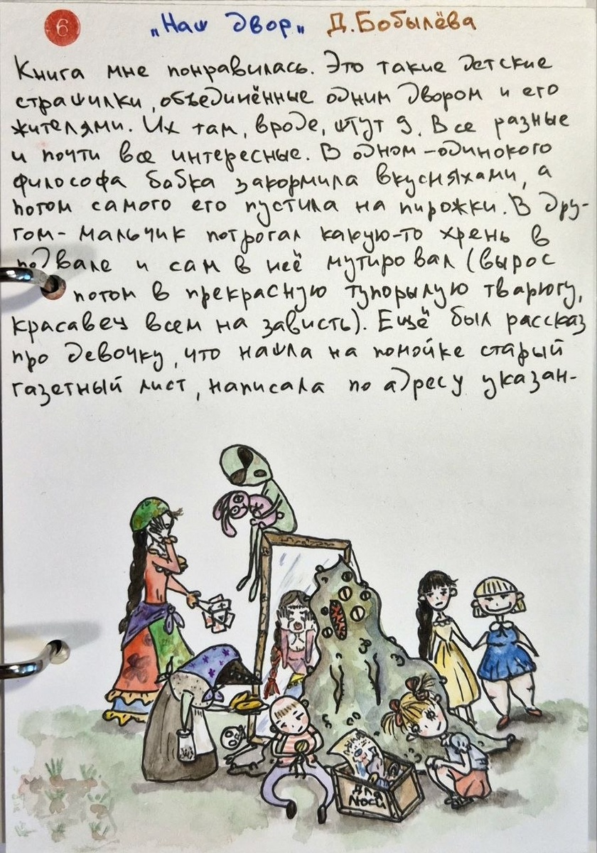 Книга мне понравилась. Это такие детские страшные рассказы, объединённые одним двором и его жителями. Их там, вроде, штук 9. Все разные и почти все интересные. В одном - одинокого философа бабка закормила вкусняхами, а потом самого его пустила на пирожки. В другом - мальчик потрогал какую-то хрень в подвали и сам в неё мутировал (вырос потом в прекрасную тупорылую тварюгу, красавец всем на зависть). Ещё был рассказ про девочку, что нашла на помойке старый газетный лист, написала по адресу указанному в газете и призвала великого УмрЪя. Были дети из дома-интерната для умственно отсталых, на которых директор ставил опыты, и была девочка Роза, сирота с «царским-даром». Была неопытная гадалка, что случайно притащила ряженного и был полтергейст, что появился из-за несанкционированной уборной в одной из коммуналок. А ещё был бомж, что на самом деле поехавший кукухой инопланетянин. И новые-русские, на борьбу с которым вышла вся местная нежить и даже Роза, что успела свалить в закат, повзрослет
