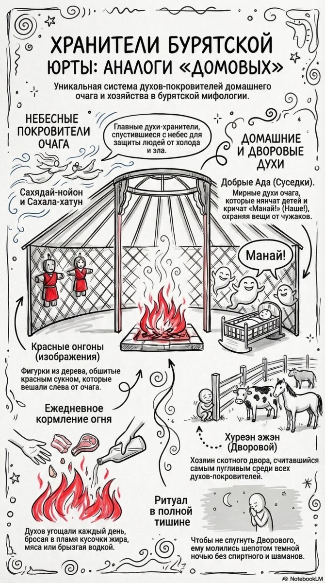 В бурятской мифологии существует уникальная система духов-покровителей домашнего очага. Высшими хранителями считаются Сахядай-нойон и Сахала-хатун. Их земным воплощением служат «Красные онгоны» — фигурки из дерева, обшитые сукном, которые вешают слева от очага. Среди домашних духов выделяются «Добрые Ада» (Суседки). Это мирные сущности, которые охраняют вещи от чужаков, выкрикивая «Манай!» (Наше!). Самым пугливым является Хозяин двора — Хуреэн эжэн. Ему молятся шепотом в полной тишине темной ночью, чтобы не спугнуть защитника скота. Важной частью традиции является ежедневное кормление огня. Духов угощают, бросая в пламя кусочки жира или мяса, обеспечивая защиту и благополучие дома. Канал нашей студии https://t.me/chimitdorzhi_studio