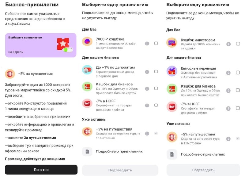 Клиентам Альфа-Банка с бизнес-картой уже доступна для выбора дополнительная категория на апрель (основные станут доступны 25.03). У разных клиентов категории могут несколько отличаться. Но всем дали скидку 5% на 1 из 600 авторских туров - категория активна по умолчанию, промокод появится 1 апреля. Правила/категории. Найти можно в обычном (не бизнес) приложении банка, в поиске - конструктор привилегий. Выбрать нужно до конца марта. Кэшбэк по доп. категории не отображается и начисляется отдельно. Бизнес-карта с бонусом 2000₽ доступна всем. Кроме 199₽/мес с 4 месяца (225₽ с НДС) платить ничего не нужно - ссылки и подробности в этом посте. Также всем доступны бизнес-карты ВТБ с кэшбэком 20%.