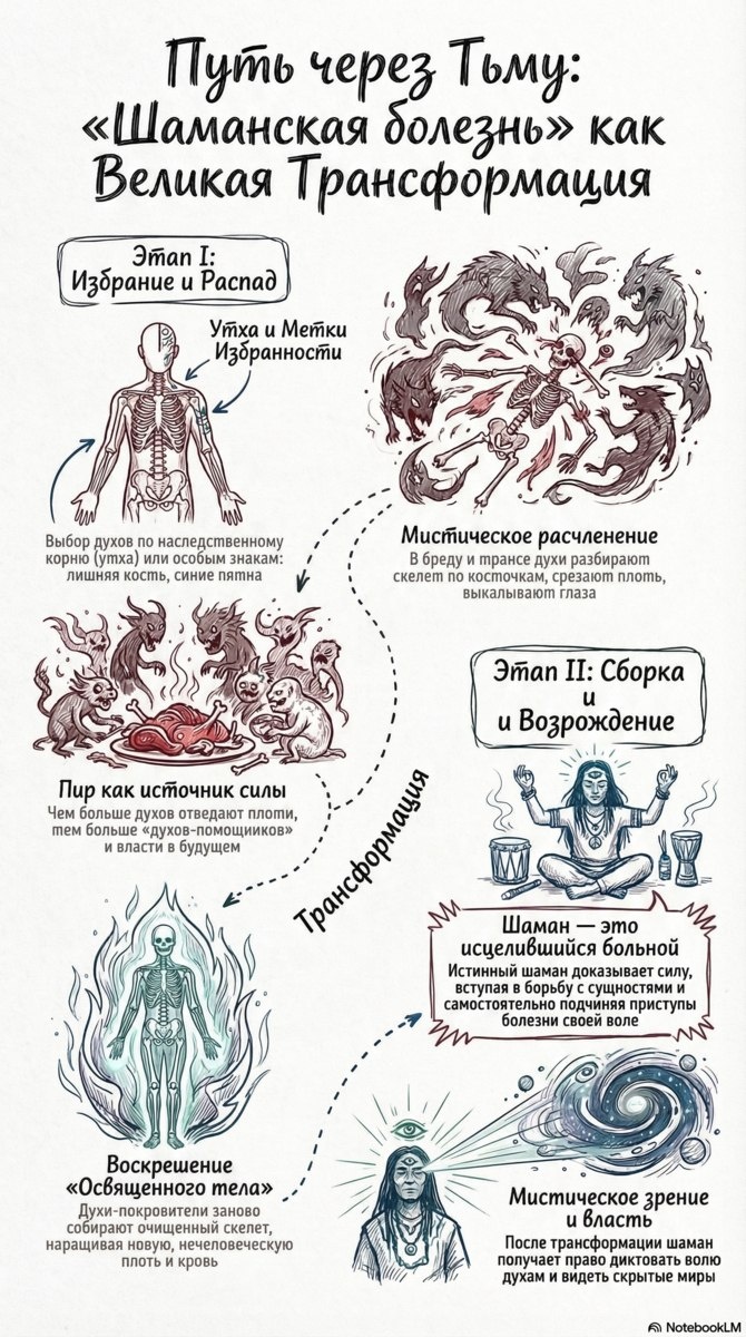 Становление шамана начинается с тяжелого испытания, известного как «шаманская болезнь». Это процесс радикального перерождения, состоящий из двух ключевых этапов. Первый этап — Избрание и Распад. Духи выбирают кандидата по наследственному корню (утха) или особым меткам. В состоянии транса происходит мистическое расчленение: духи разбирают скелет по косточкам и срезают плоть. Чем больше сущностей «угостилось» телом, тем больше помощников будет у шамана в будущем. Второй этап — Сборка и Возрождение. Духи-покровители заново собирают очищенный скелет, наращивая новую, сверхчеловеческую плоть. Шаман — это «исцелившийся больной», который сумел подчинить приступы болезни своей воле. После этой трансформации он обретает мистическое зрение и право диктовать волю духам. Канал нашей студии https://t.me/chimitdorzhi_studio