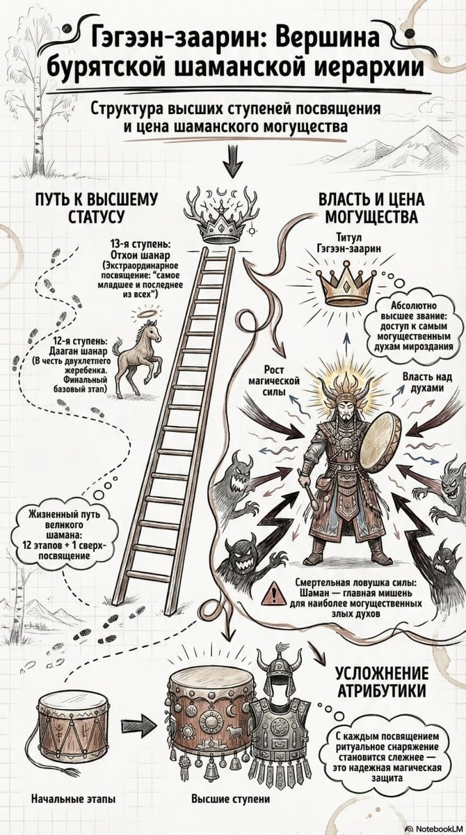 Бурятская традиция предусматривает строгую структуру посвящений. Путь к высшему статусу состоит из 12 базовых ступеней и одной экстраординарной — 13-й (Отхон шанар). Титул Гэгээн-заарин является абсолютно высшим званием. Такой шаман обладает доступом к самым могущественным духам мироздания и полной властью над ними. Однако это могущество имеет свою цену: великий шаман становится главной мишенью для наиболее опасных злых сущностей. С каждым новым посвящением ритуальное снаряжение усложняется. Нагрудники, шлемы и декор бубна становятся тяжелее. Это не просто украшения, а надежная магическая броня, необходимая для защиты на высших уровнях взаимодействия с иными мирами. Канал нашей студии https://dzen.ru/id/670c7fe545d6d72caa724e37