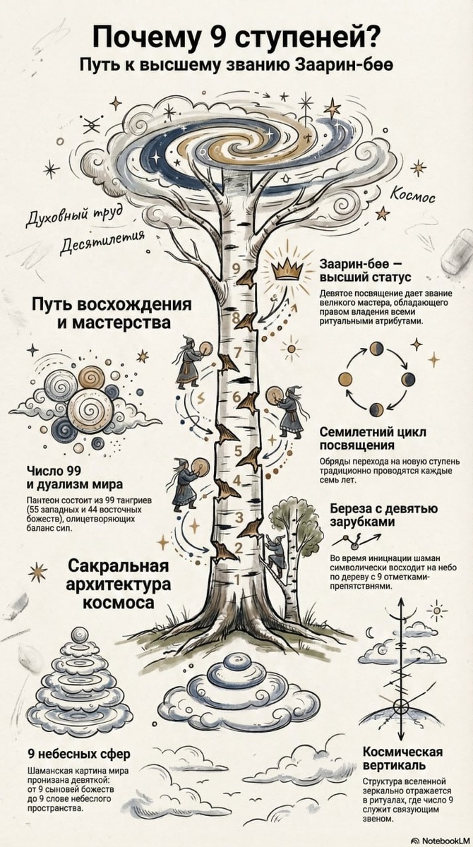 Число девять — это сакральный код бурятской картины мира, пронизывающий всё мироздание: от девяти сыновей божеств до девяти слоев небесного пространства. Новая инфографика раскрывает архитектуру шаманского восхождения. Космическая вертикаль: Структура вселенной зеркально отражается в ритуалах. Во время инициации шаман символически восходит на небо по березе с 9 зарубками-препятствиями. Семилетний цикл: Обряды перехода на новую ступень традиционно проводятся каждые семь лет, требуя десятилетий упорного духовного труда. Число 99 и дуализм: Пантеон из 99 тангриев (55 западных и 44 восточных) олицетворяет баланс сил, который мастер учится удерживать на пути к мастерству. Заарин-бөө: Девятое посвящение дает статус великого мастера. Это высший сан, дающий право владения всеми ритуальными атрибутами и способность свободного перемещения между мирами. Канал нашей студии https://dzen.ru/id/670c7fe545d6d72caa724e37