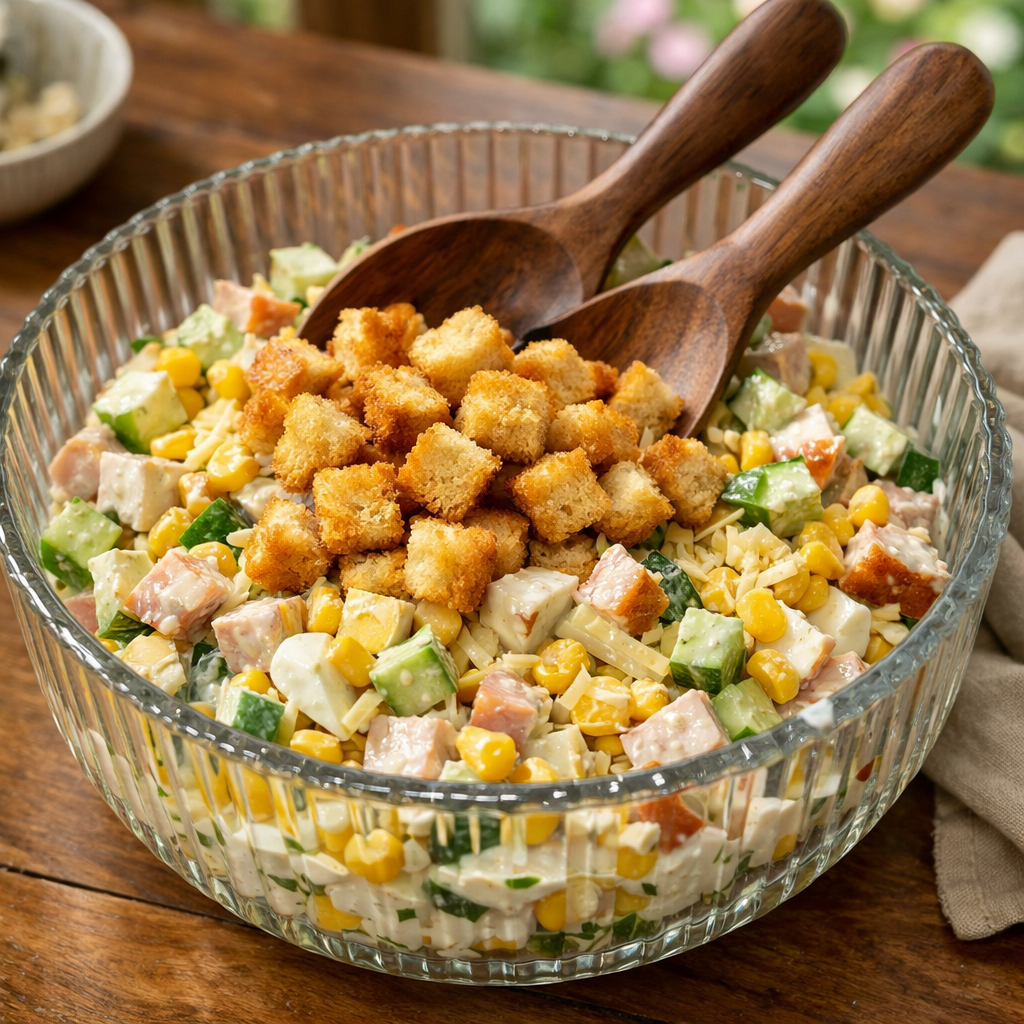 - Чем можно заменить ингредиент: Если вы не едите копчености, смело заменяйте копченую грудку на отварную говядину или даже на хорошую ветчину из индейки. Получится чуть более диетический, но не менее вкусный вариант. А магазинную кукурузу можно заменить на свежемороженый зеленый горошек (только обдайте его кипятком).