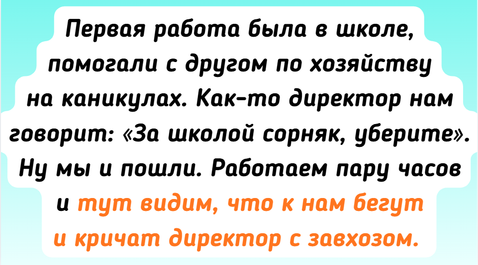 - Первая работа была в школе, помогали с другом по хозяйству на каникулах. Как-то директор нам говорит: «За школой сорняк, уберите». Ну мы и пошли. Работаем пару часов и тут видим, что к нам бегут и кричат директор с завхозом. Оказалось, что директор подумал, что это сорняки, а это были декоративные кусты, которые как-то по умному назывались, я уже и не вспомню. Нам за это ничего не было, простили нас, молодых, а вот директор тогда от завхоза знатно получил.