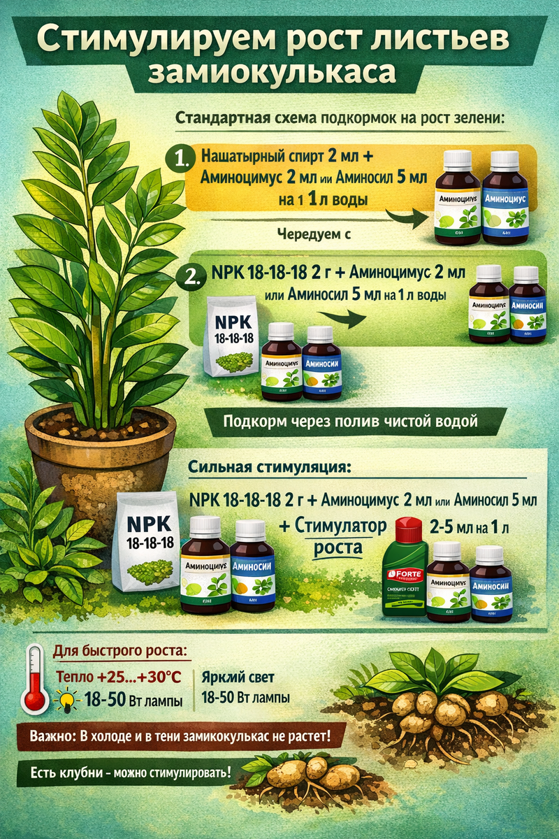 Расшифровка по карточке — стимулируем рост листьев замиокулькаса 🌱 Стандартная схема подкормок на рост зелени: 1️⃣ Удобрение: