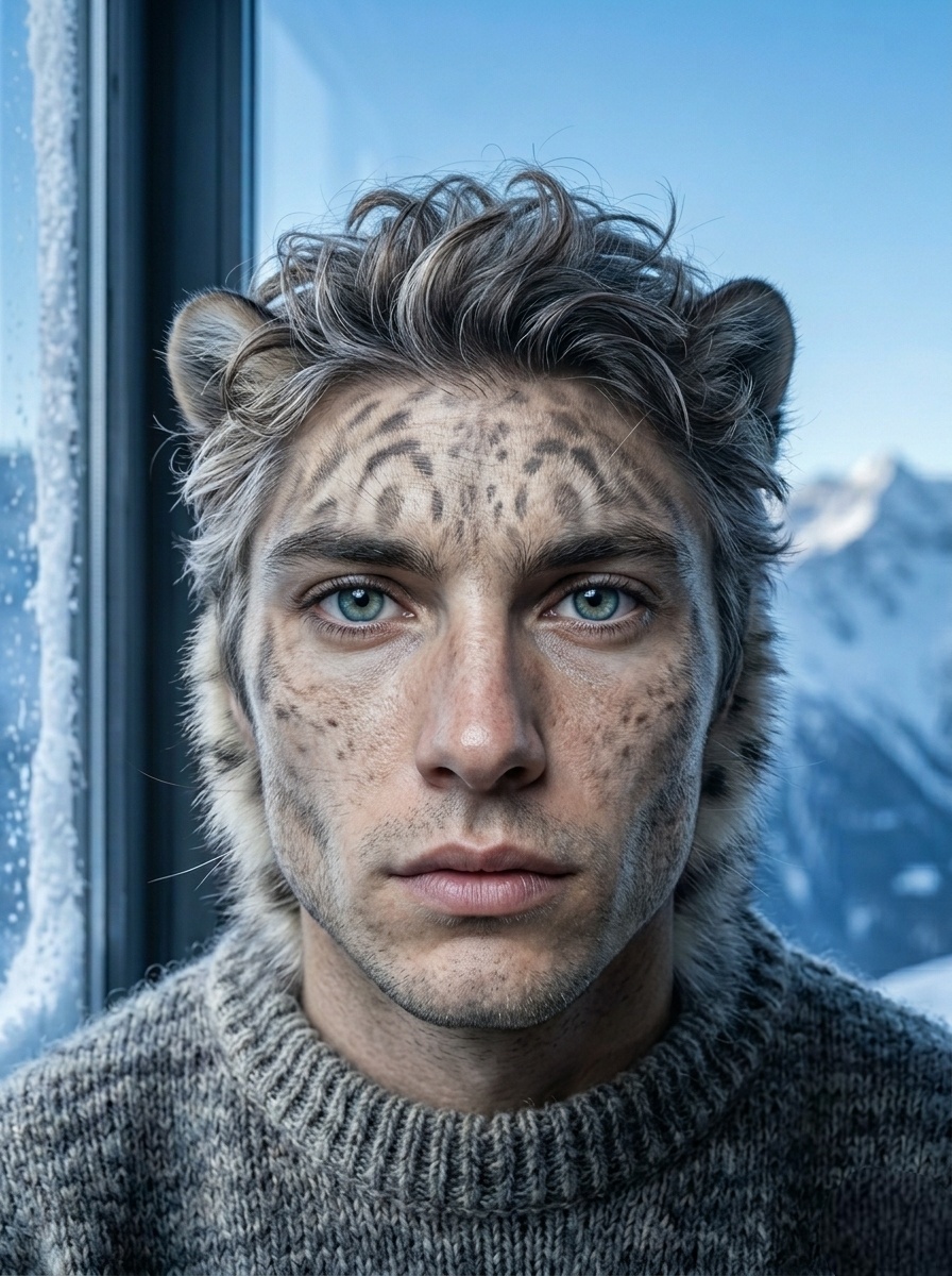 Natural hybrid portrait, man with snow leopard features: thick soft gray-white spotted fur framing face and neck, large round pale blue eyes that see through everything, small rounded ears blending into tousled hair, calm wise and slightly melancholic expression of someone who has seen too much, cold blue morning light from high window, snowy mountain ridge bokeh, realistic skin-fur transition, hyper-detailed texture, emotional depth, 32k --ar 3:4 --stylize 290 --q 2 --v 7