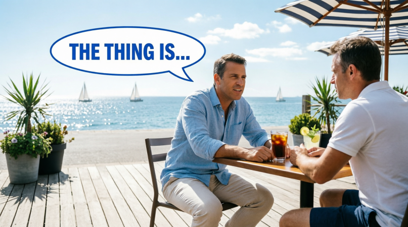 В английском есть фразы, которые помогают структурировать речь, звучать более выразительно и избегать неловких пауз в разговоре.Одна из таких фраз The thing is...(Дело в том, что.. )Посмотрим, как можно удобно использовать эту фразу в речи. Например, на картинке выше джентльмен мог бы продолжить свою фразу так: The thing is, I am not ready yet(Дело в том, что я еще не готов) или, например, так: The thing is I haven't been here before (Дело в том, что я не бывал здесь раньше), в зависимости от темы разговора. То есть, когда в разговоре вы ощущаете, что вам нужно передохнуть секунду-другую(разговор на иностранном языке может быть значительной нагрузкой для мозга, особенно при недостаточной практике) или когда вы обдумываете ответ на вопрос, можно на автомате сказать "The thing is"...взять естественную паузу и подумать, как лучше построить дальнейшую фразу. Например,если у вас спросят, почему вы отказались от предложенной вакансии, вы можете сказать, "The thing is, I found a better job"