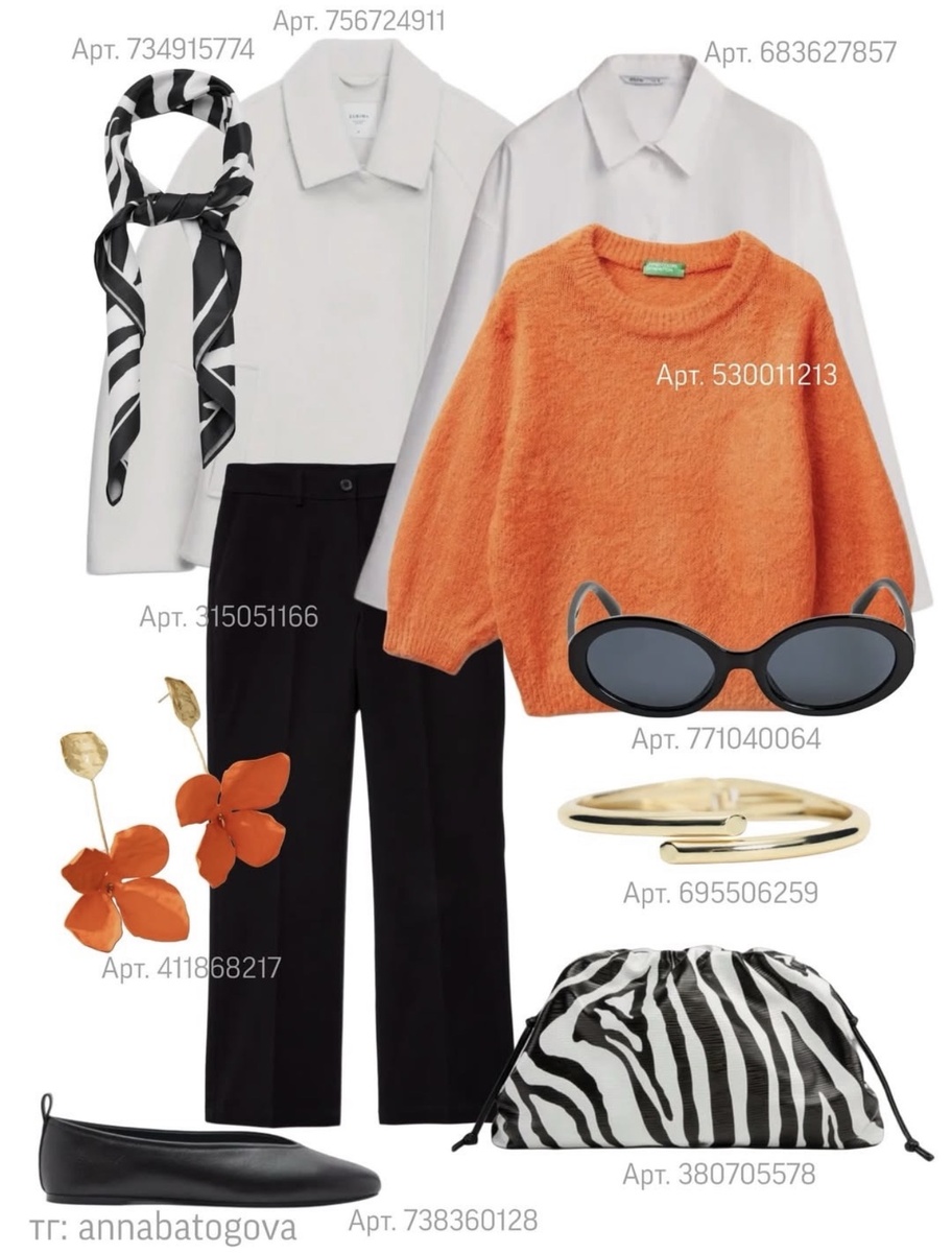 Но всё оживает за счёт акцентов — оранжевый свитер, серьги, принт.