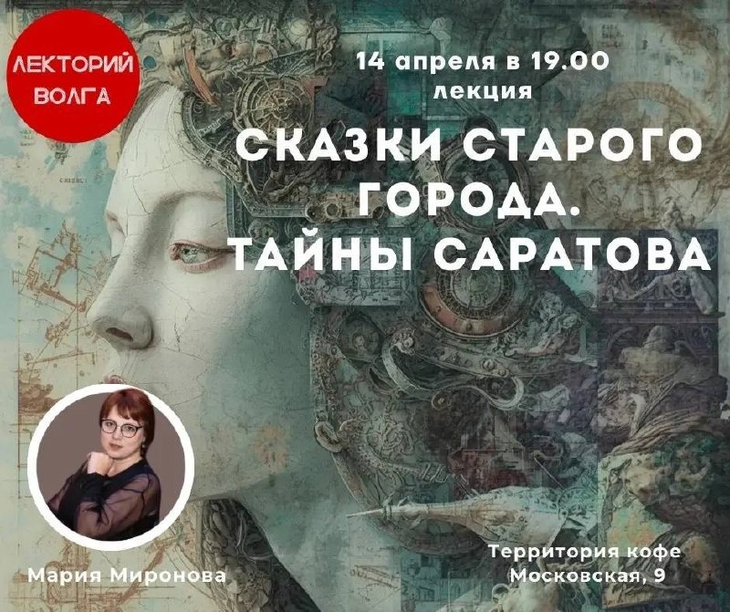 Лекторий «Волга» приглашает на лекцию Марии Мироновой 14 апреля в 19.00 (вторник) "СКАЗКИ СТАРОГО ГОРОДА. Тайны Саратова." У нашего города есть иная, потаённая биография? Та, что написана не в учебниках, а в легендах, передаваемых шепотом. На этой встрече мы: 🧱Отправимся на поиски кладов, которые, по преданиям, до сих пор спрятаны в саратовской земле. Вы узнаете, где стоит внимательнее смотреть под ноги. 🗝️Познакомимся с местными "невидимками" — мифическими существами и духами, которые, как говорят, обитают в старых двориках, на берегах Волги и в городских легендах. Они рядом, но мы разучились их замечать. 🗺️Составим карту мифологического Саратова — города, живущего параллельно с официальным, полного загадок и невероятных сюжетов. 🧜♀️Узнаем какие мифы и легенды связаны с фигурами в лепнине. 🪽Как в саратове появился АНГЕЛО-демон Как можно прочитать здание и догадаться, что в нем находилось? 🪧Мы узнаем о самом страшном кладе, который был найден в Саратове Это путешестви