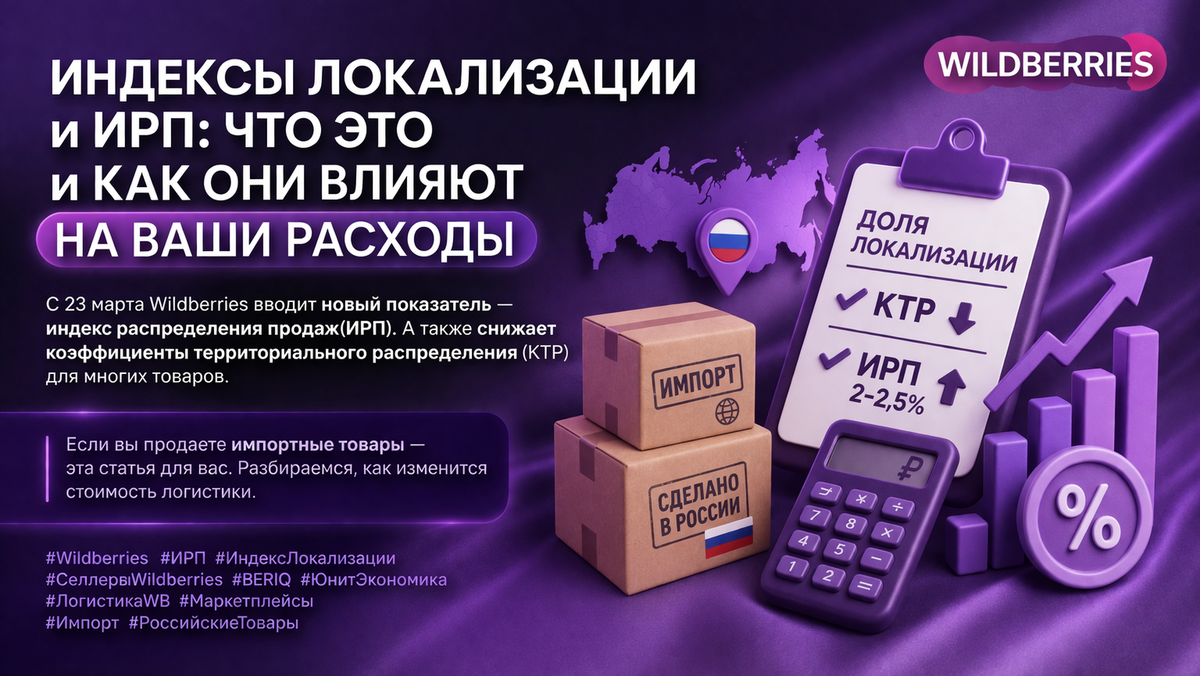 С 23 марта Wildberries вводит новый показатель — индекс распределения продаж (ИРП). А также снижает коэффициенты территориального распределения (КТР) для многих товаров. Если вы продаете импортные товары — эта статья для вас. Разбираемся, как изменится стоимость логистики. Доля локализации — это процент заказов, которые доставили на склады Wildberries с российских производств. Простыми словами: если ваш товар сделан в России — это хорошо. Если привезен из-за границы — это может быть дороже. КТР (коэффициент территориального распределения) влияет на индекс локализации. Чем выше индекс локализации — тем дороже логистика. Что изменилось: Wildberries снизил КТР для товаров с долей локализации от 5% до 55% и от 75% до 95%. Главное: логистика для этих товаров станет немного дешевле. Например: ИРП (индекс распределения продаж) — это новый платеж, который добавляется к стоимости логистики. Как считается: ИРП — это процент от цены товара. Процент зависит от доли локализации. Таблица простая: В