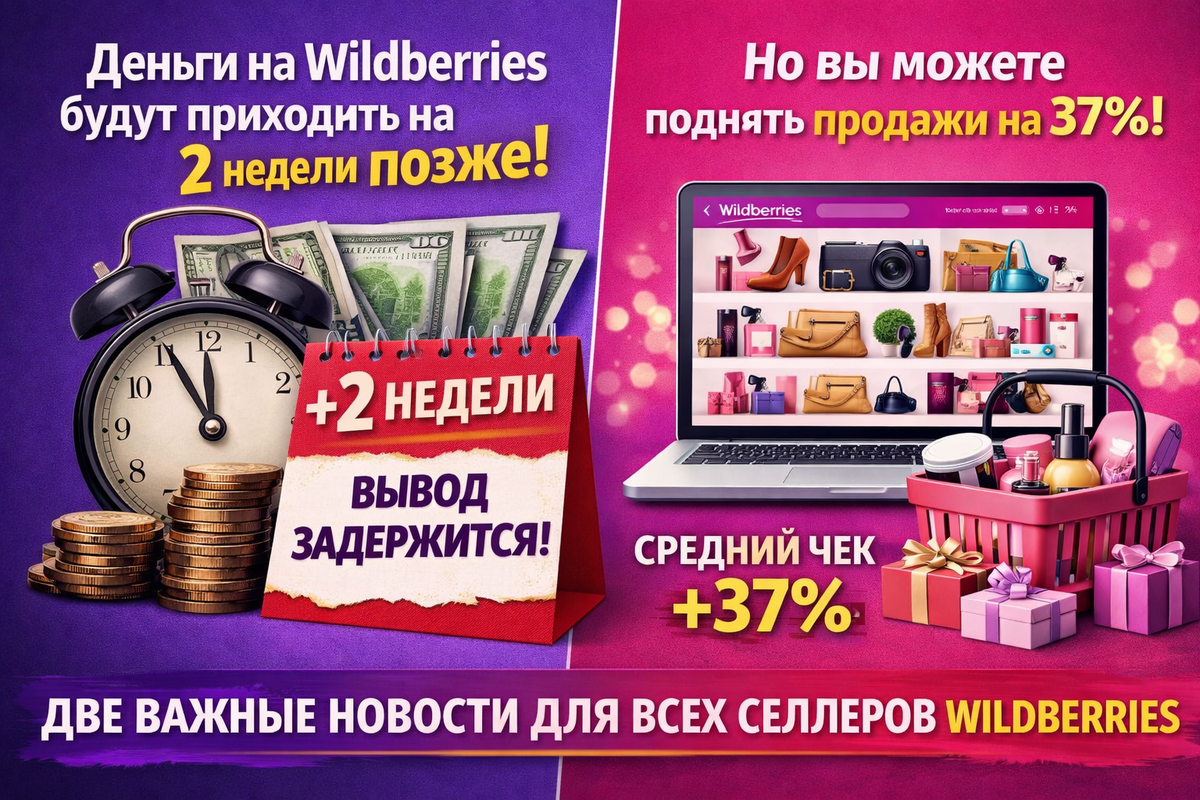 Две важные новости для всех селлеров Wildberries. Первая — не очень приятная: деньги будут выводиться на 2 недели позже. Вторая — отличная: у вас есть возможность поднять средний чек на 37%. Разбираем обе. С 30 марта Wildberries увеличивает срок вывода денег на 2 недели. Разница: деньги зависают на Wildberries на 2 недели дольше. Нужно планировать cash flow (оборотный капитал) с учетом задержки. Деньги, заработанные в марте, вы получите только в апреле. Рекомендация: с 23 марта по 12 апреля можно выводить только деньги, заработанные до 16 марта. Учитывайте это при планировании расходов. Wildberries провел большое исследование и выяснил интересную вещь. Проанализировали более 4 миллионов товаров. Сравнили два сценария: Результат: во втором сценарии средний чек выше на 37%. Когда покупатель заходит на страницу продавца, он видит все ваши товары сразу. Ему проще: Простыми словами: страница продавца работает как ваш собственный магазин. Если она оформлена хорошо, покупатель задерживается