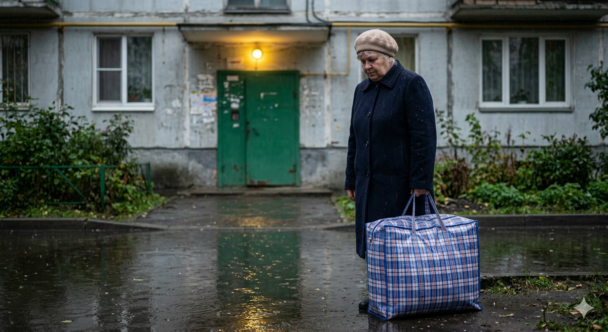 У облезлого подъезда, среди луж и опавшей листвы, возвышалась монументальная фигура. В кашемировом берете и тяжёлом пальто Ольга Петровна выглядела как скала, которую не под силу сдвинуть ни ветру, ни обстоятельствам. Рядом с ней сиротливо мок огромный, туго набитый клетчатый баул — верный спутник всех её «внезапных» визитов.