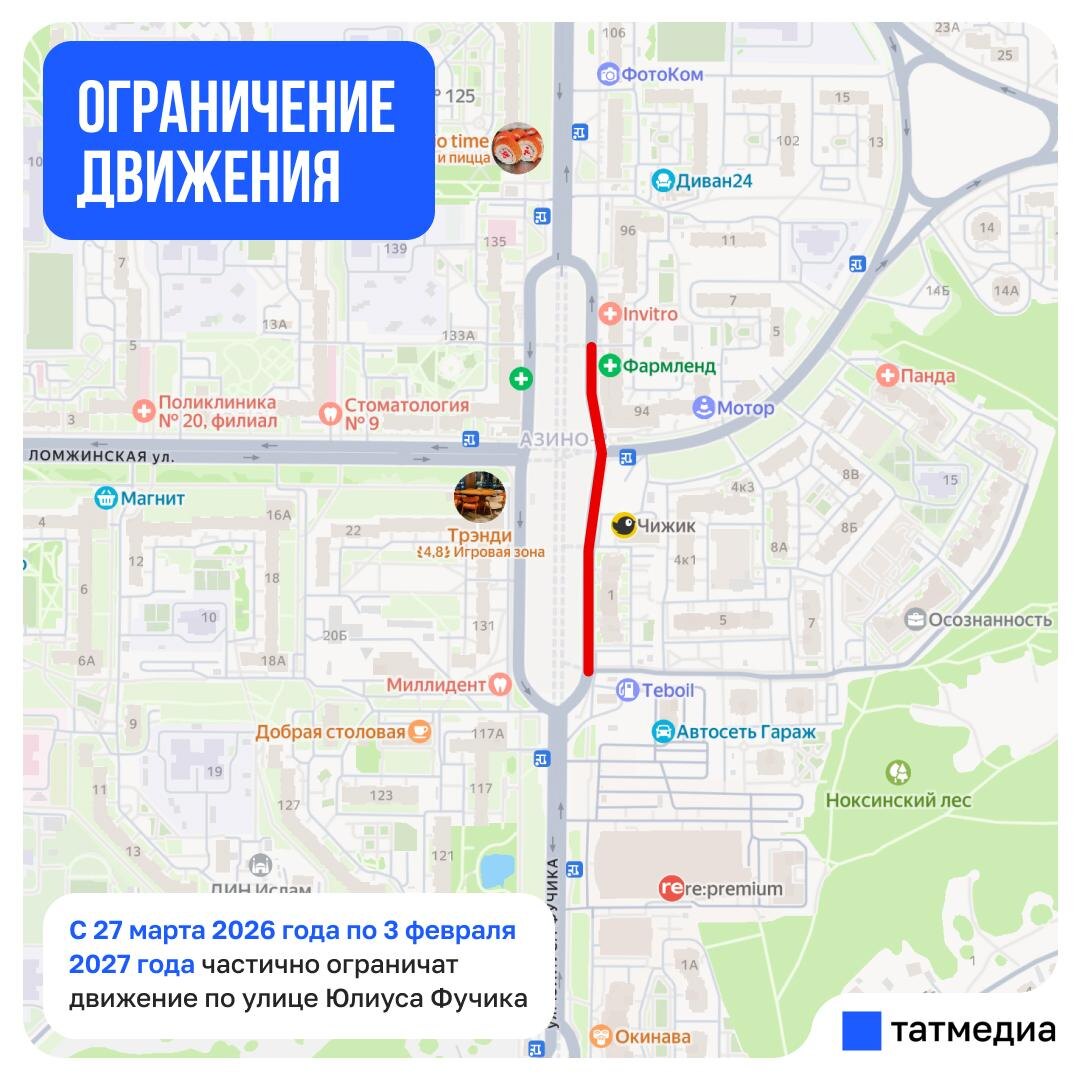 Причина – строительство первого участка второй линии метрополитена. Ограничения будут действовать с 27 марта 2026 года по 3 февраля 2027 года. Движение частично перекроют на участке от дома №94 по улице Юлиуса Фучика до проезжей части улицы Чингиза Айтманова. @tatmediaofficial | Telegram замедлен, читайте Татмедиа в MAX