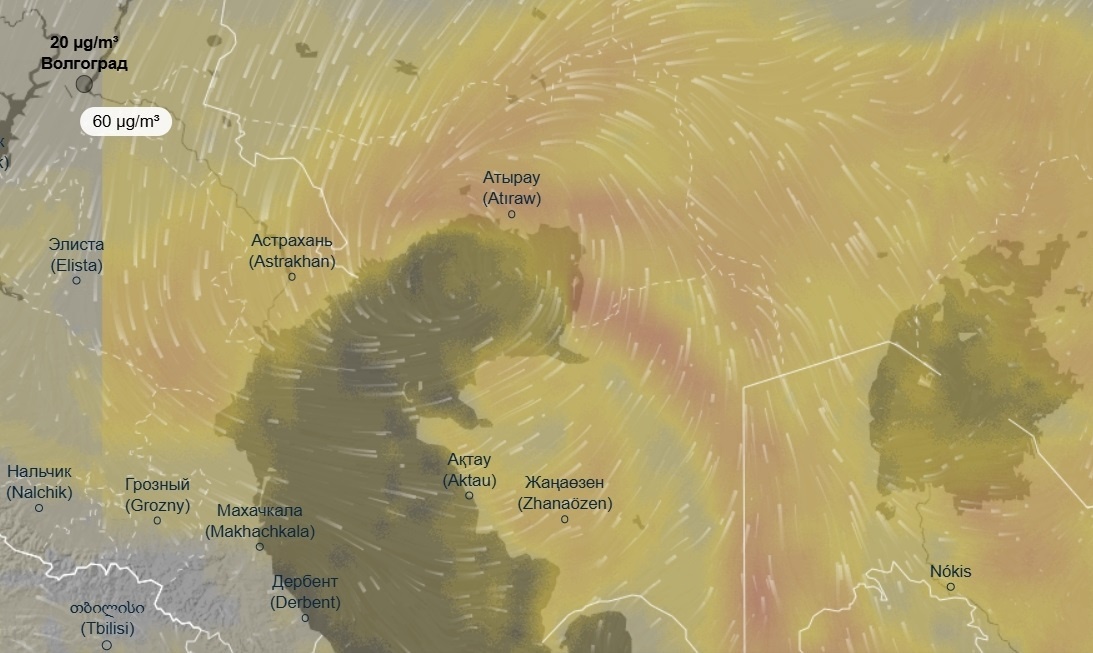Основной источник пылевого загрязнение, откуда сейчас активно задувает ветер в сторону Волгограда, пока находится в районе туркменистанского города Балканабад. Здесь загрязнение составляет до 300 микрограмм пыли на метр кубический. Частички несет через казахстанский город Атырау и лихо закручивает в воздушном потоке над Каспийским морем. В результате пыльная буря активно кружит в районе Астрахани и Элисты. Наиболее мощные пыльные бури наблюдаются в зоне пустынь, где находится ливийский город-оазис Сабха. Здесь загрязнение составляет более 2 тысяч микрограмм пыли на метр кубический. Все эти потоки несутся в сторону Саудовской Арави
