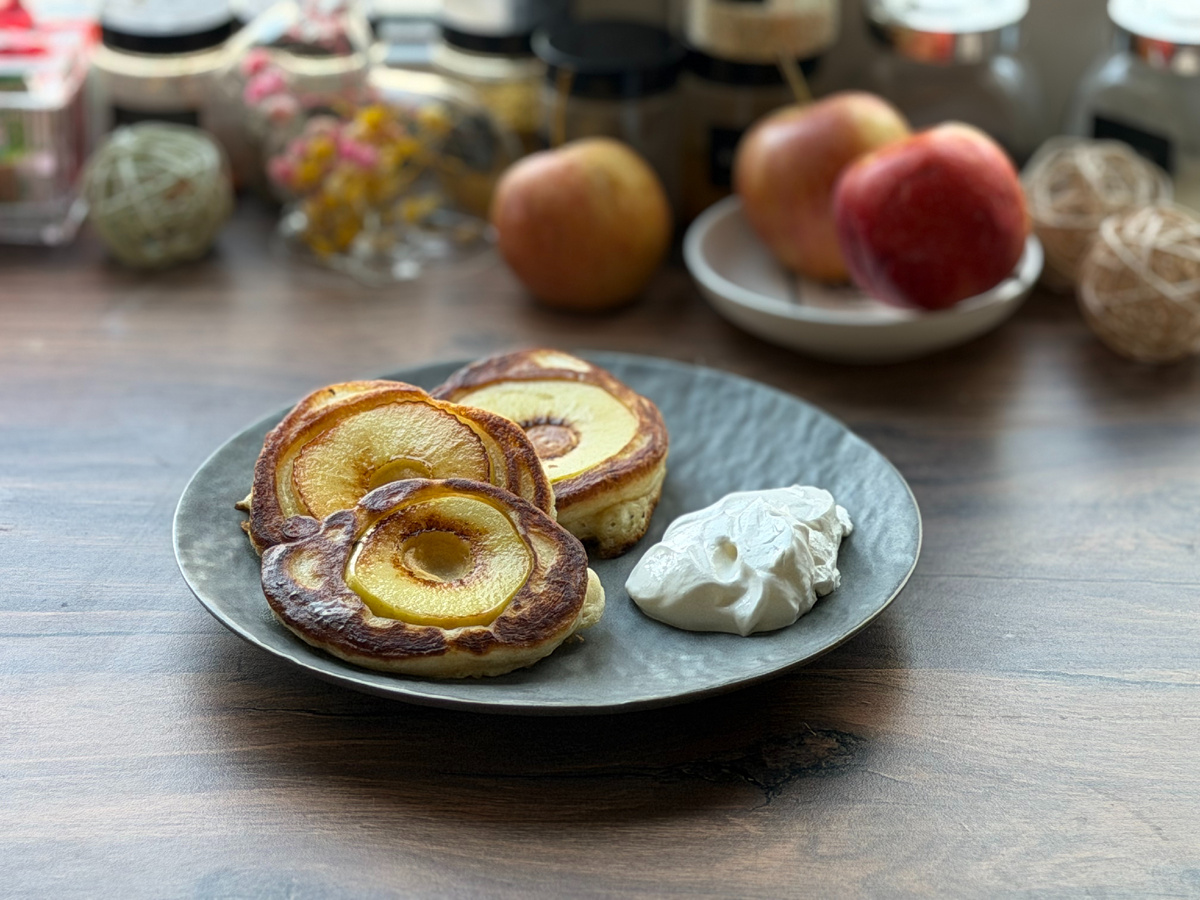 Бывает, что какая-то еда просто не выходит из головы, а всё никак — то времени нет, то настроение не то, то звёзды не сошлись. И вот наступает тот самый день, когда всё совпадает. И ты понимаешь: сегодня. Сегодня — день оладий. У меня так и случилось. Я очень хотела оладушки с яблоками, они мне снились, кажется. Но всё откладывала. А сегодня утром проснулась и поняла — пора. Звёзды сошлись, настроение есть, и в душе поёт весна. И вот они, пышные, румяные, с яблочной кислинкой и сахарной пудрой. Сегодня я довольная, счастливая, и жизнь бьёт ключом. В миске смешайте кефир, яйца, сахар и соль. Взбейте венчиком. Просейте муку и добавляйте постепенно, помешивая, чтобы не было комочков. Тесто должно получиться как густая сметана — медленно стекать с ложки. Соду добавьте в самом конце, аккуратно перемешайте. Появятся пузырьки — это кефир реагирует с содой. Оставьте тесто постоять 10–15 минут. Оно станет ещё пышнее. Яблоки вымойте, обсушите. Удалите сердцевину (можно специальным ножом или тонк