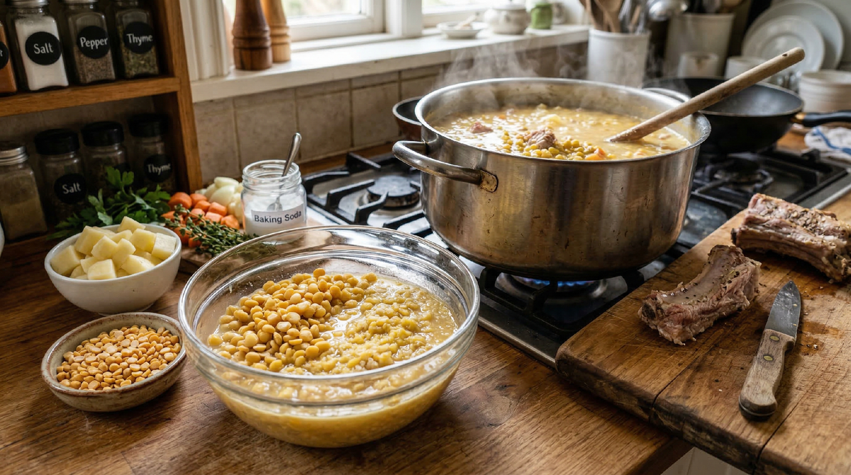 Самое важное, что я усвоила: после замачивания горох нужно очень тщательно промыть. Именно промывание убирает ту самую мыльность, которая появлялась, когда я добавляла соду прямо в суп. Содовый раствор делает свою работу — размягчает оболочку — и после этого его нужно полностью удалить. Варить горох следует уже в чистой воде, без всякой соды.