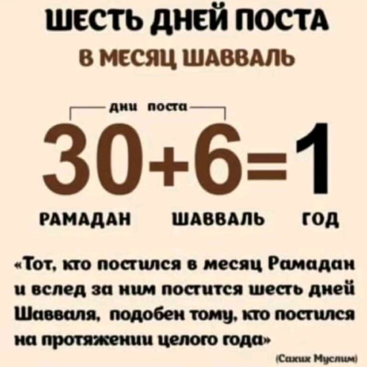 Касательно поста в месяц Шавваль согласно хадису, приведённому в сборнике Сахих Муслим во втором томе В книге поста под номером 2614 наш любимый пророк Мухаммад сказал: "Каждый, кто постился в месяц Рамадан, а затем добавил к нему 6 дней из месяца Шавваль, будет подобным постившегося целый год."