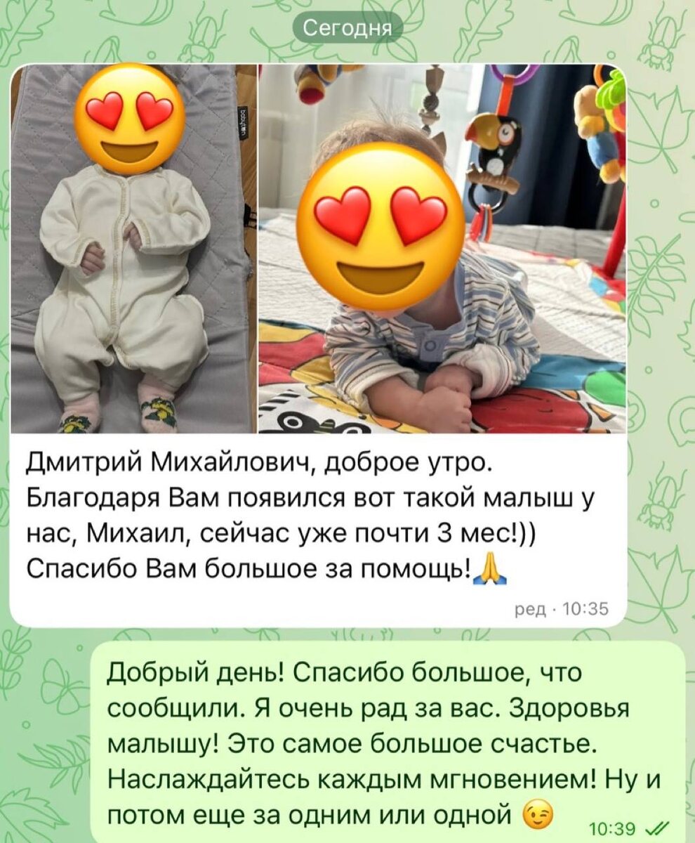 ! 👋 Сегодня получил такое прекрасное сообщение - в нашей стране на одного мальчишку стало больше и я к этому имею небольшое отношение!😊 Как же приятно получать эти весточки! Помню, когда впервые я пошел разговаривать с заведующим отделением «Брак и Семья» с Анатолием Николаевичем Аксенфельдом, чтобы устроиться в отделение и начать свой путь в андрологии, где-то в далеком 2009 году, он сказал: пациенты, которые не могут зачать ребенка, - самые благодарные. Но не в плане денег или подарков, а в плане уважения к доктору как к профессионалу, который помог им подарить самое главное счастье в этой жизни. Но, если честно, по факту пациенты очень редко сообщают о наступлении долгожданной беременности, и ты как специалист не знаешь полноценно о результатах своей работы. Узнаешь либо случайно, либо когда пациенты возвращаются к тебе с другой проблемой или за повторной беременностью. Или, может, поколение совершенно другое 🤔 И раньше более активно сообщали. Как думаете? И вот такие редкие,