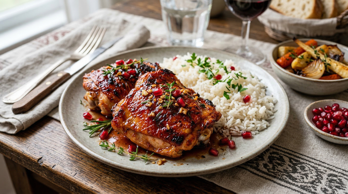 Суть проста: кислота гранатового сока размягчает мясные волокна, чеснок добавляет глубину вкуса, а при запекании на поверхности образуется та самая кисло-сладкая глянцевая корочка, ради которой хочется готовить это блюдо каждую неделю. Бёдра получаются сочными внутри и карамельно-румяными снаружи. Звучит как ресторанная подача, а по факту — минимум усилий и вполне бюджетный набор продуктов.