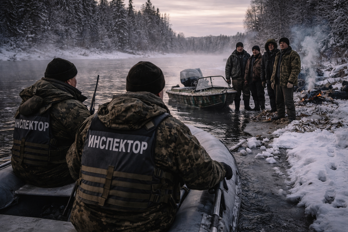 Река в тот день была тяжёлая, серая, живая, как будто сама не хотела пускать никого в свои повороты, потому что лёд уже начал схватывать берега, но середина ещё держала течение, и чёрная вода медленно тянула редкие льдины, сталкивая их друг с другом, и от этого шёл глухой звук, который в тишине разносился далеко, и именно в такие дни обычно и идут рейды, потому что обычный человек сюда не полезет, а тот, кто идёт — значит, идёт не просто так, и потому они вышли рано, ещё до света, когда туман лежал над водой плотной полосой, и мотор держали почти на холостых, чтобы не выдавать себя раньше времени, потому что в тайге звук — это половина всей игры, и если тебя услышали, значит, тебя уже ждут или уже ушли, и тогда вся дорога становится пустой, как будто здесь никого и не было, и в лодке их было двое — старший инспектор, который ходил по этим рекам уже не первый год и знал, где искать даже тогда, когда ничего не видно, и молодой, который только набирался опыта, но уже научился смотреть не просто вперёд, а по сторонам, выхватывая из общего пейзажа то, что выбивается, потому что именно такие мелочи и выдают человека в тайге, не след сам по себе, а то, как он вписан в место, и первые километры прошли спокойно, как и бывает всегда, когда кажется, что рейд будет обычным — нашли старую сеть, вмерзшую у берега, сняли, свернули, прошли мимо заброшенной стоянки, где остались только почерневшие брёвна и перекошенный навес, и всё это не вызывало тревоги, потому что было привычным, но потом река стала уже, повороты — резче, берега нависли ближе, и именно в таких местах чаще всего и прячутся, и когда они заходили в очередной изгиб, старший поднял руку, и мотор сразу сбросили, потому что он увидел то, что нельзя было пропустить — дым, не ровный, не спокойный, а рваный, как будто его пытались спрятать, и это сразу меняло всё, потому что обычный человек не прячет дым, а значит, там не просто сидят, там работают, и не хотят, чтобы их нашли, лодку заглушили и дальше пошли на вёслах, позволяя течению самому нести их ближе, и каждый звук теперь становился важным, даже лёгкий плеск воды мог выдать их раньше времени, когда они обогнули поворот, увидели протоку, уходящую в сторону, и у берега стояла лодка — чужая, без номеров, не местная, и этого уже было достаточно, чтобы понять — дальше будет не просто проверка, они причалили ниже, чтобы не выйти прямо на людей, закрепили лодку и пошли пешком, медленно, без разговоров, и уже через несколько шагов увидели следы — не один человек, несколько, и шли они с нагрузкой, потому что снег продавлен глубоко, шаг тяжёлый, уверенный, и это сразу говорило о том, что здесь работают, и работают не первый день, дальше начали попадаться обрезки сетей, спрятанные под снегом, остатки рыбы, которые не стали забирать, потому что спешили, следы костра, который пытались замаскировать, и всё это складывалось в одну картину, и когда впереди послышались голоса, оба остановились, потому что дальше уже нельзя было идти просто так, старший присел, выглянул из-за дерева, и то, что он увидел, задержало его на секунду дольше, чем обычно, потому что там было не двое и не трое, а целая группа, и это уже меняло всё, потому что такие встречи редко проходят спокойно, и в такие моменты всё решает первый шаг, первый взгляд, первое слово, они вышли не сразу, сначала оценили — сколько людей, как 
