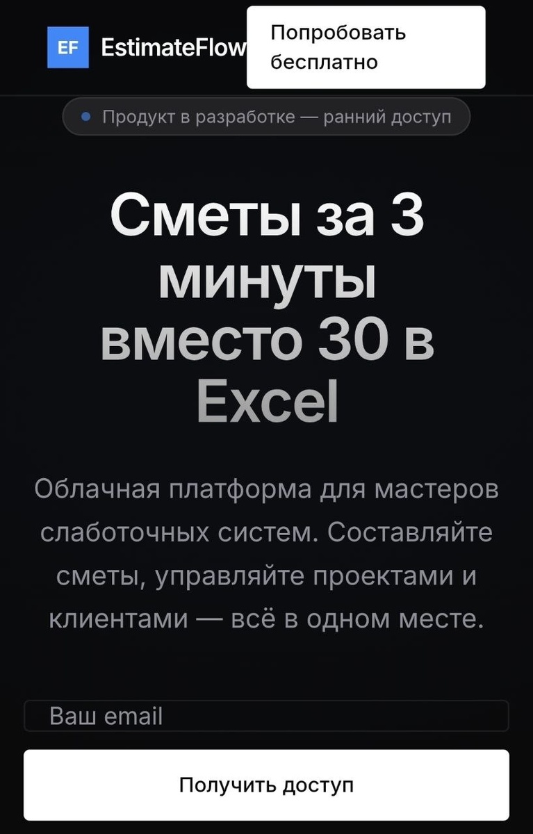 🏁 Сегодня в голове крутились две важные аббревиатуры: MVP и Бета-тест. Вроде бы модные слова, но что они значат конкретно для моего проекта? И почему я чувствую, что уже почти у цели? Что такое MVP? 🛠 Это не «сырой» или «недоделанный» продукт. Это Минимально Жизнеспособный Продукт. Представь, что ты монтируешь систему видеонаблюдения для клиента. ❌ *Неправильный путь (не MVP):* Привезти на объект коробки с камерами, кабель и регистратор. Всё есть, все оборудование на месте. Но ничего не подключено, настройки нет, картинки на телефоне у клиента нет. Пользы ноль, хотя «всё куплено». ✅ *Путь MVP:* Установить всего 2 камеры вместо запланированных 10. Но: они установлены, подключены, кабель уложен, регистратор настроен, клиент видит картинку на телефоне и может видеть «запись». Система маленькая? Да. Она не покрывает весь периметр? Нет. Но она работает и решает главную задачу — охранять вход. Ею уже можно пользоваться. Для EstimateFlow мой MVP — это именно такая «работающая пара ка