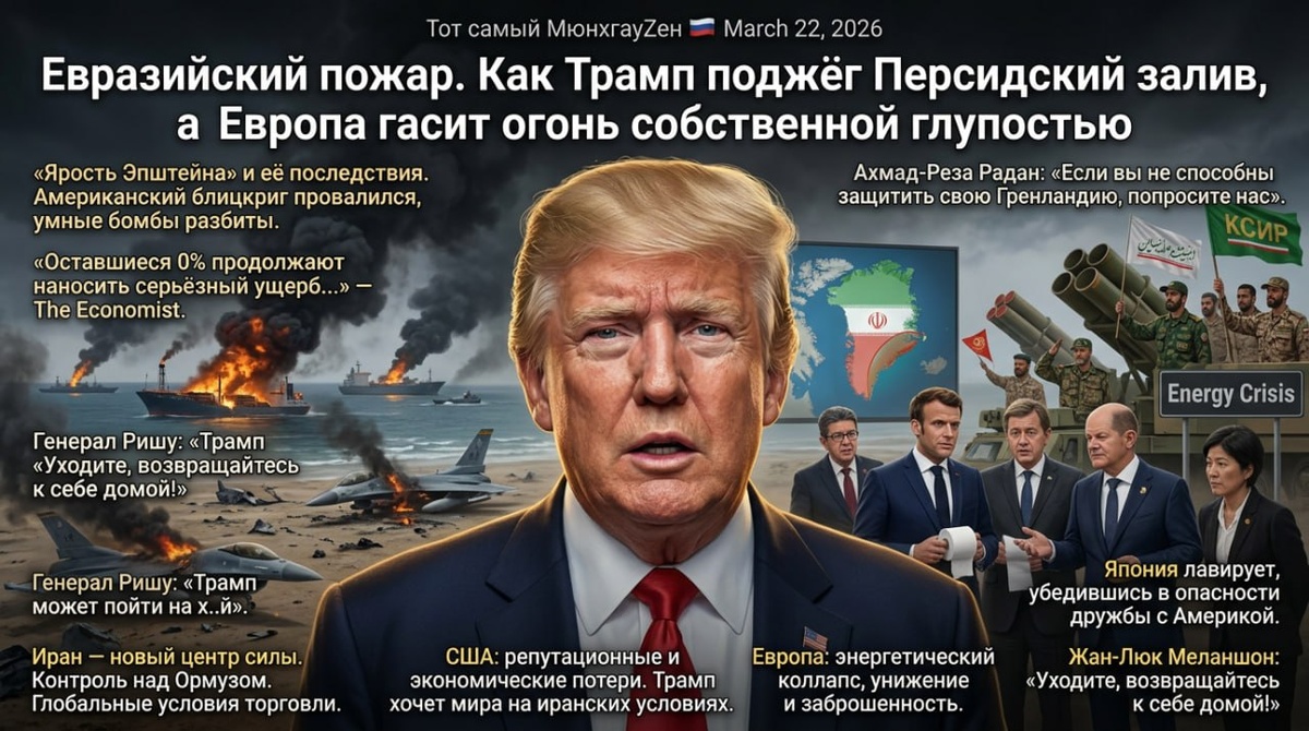 🚨 МюнхгауZен: Евразийский пожар. Как Трамп поджёг Персидский залив, а Европа гасит огонь собственной глупостью Мир в эти мартовские дни 2026 года напоминает разогнанную оркестровую яму, где каждый музыкант играет свою партию, но дирижёр, похоже, потерял пульт. Ближний Восток пылает так, что дым стелется над проливами, сжимая горло мировой экономике. Америка, затеявшая блицкриг против Ирана, с удивлением обнаруживает, что её «умные бомбы» разбиваются о волю древнего народа, а европейские союзники, вместо того чтобы прийти на подмогу, судорожно пересчитывают расходы на туалетную бумагу и увольняют бортпроводников. В этой многоплановой драме Россия, как и подобает великой Державе, сохраняет спокойствие, внимательно вглядываясь в ход событий и делая выводы, которые лягут в основу нового, справедливого миропорядка. 🔥 Часть 1. Ближневосточный узел: три недели, которые потрясли Вашингтон 1. «Ярость Эпштейна» и её последствия Операция, задуманная как демонстрация американской мощи, оберн
