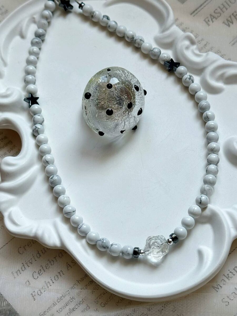 🤍 Колье из стекла в оттенке белого камня с тонкими серыми прожилками создают ощущение чистоты и спокойствия, однако за счёт чёрных вставок в форме звёзд и холодного металлического блеска они не выглядят наивно, а приобретают характер и внутреннюю глубину. Прозрачный акцент в центре добавляет лёгкость, поэтому композиция кажется живой и объёмной. Кольцо словно собрало в себе воздух и мерцающую текстуру сусального серебра, которая напоминает застывший морозный узор, и благодаря этому сочетанию прозрачности и тёмных точек оно притягивает взгляд, но не перегружает образ.⭐️ Колье 4800 Кольцо 5100 ✨Нажмите для заказа ✉️ Нажмите чтобы задать вопрос