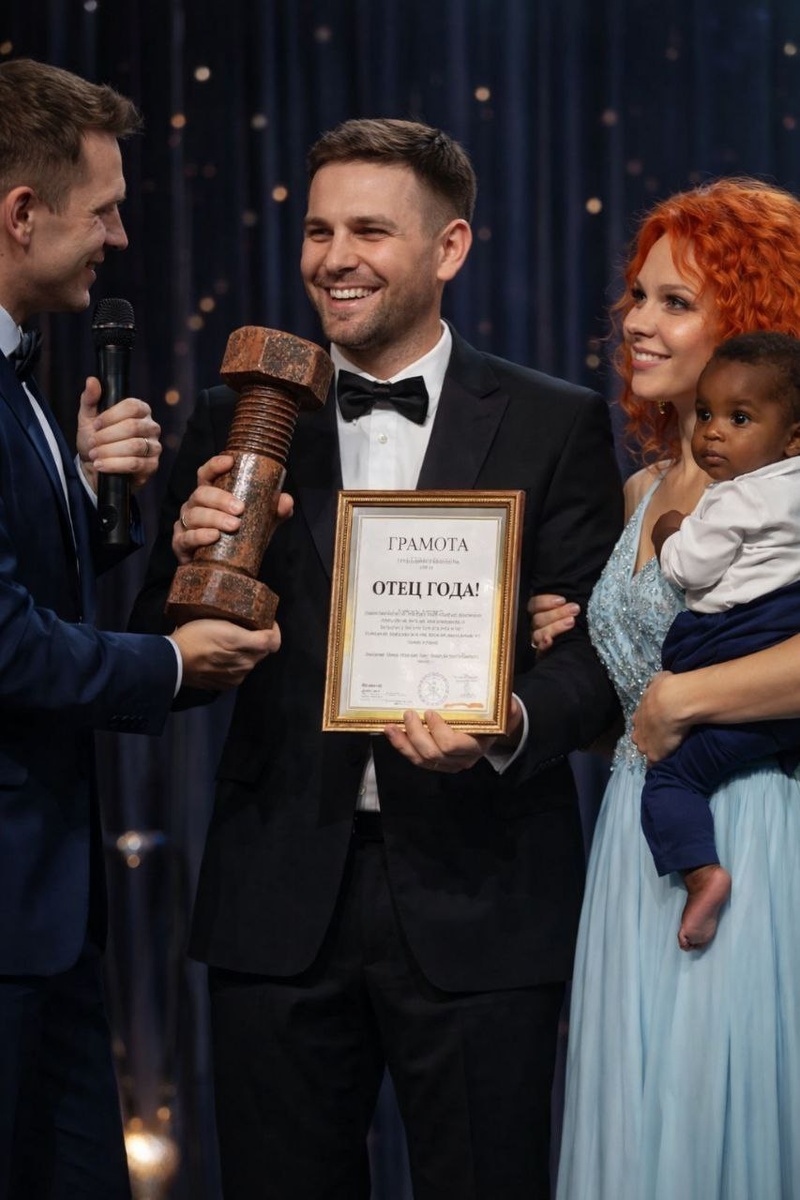 Участник конкурса. Создай реалистичный кадр. Мужчина стоит на сцене, проходит вручение премии " Отец года! " Рядом с мужчиной стоит женщина с младенцем африканцем на руках, Ведущий дарит мужчине огромный ржавый болт и грамоту. Одежда: праздничная одежда, прически Если тормозит Telegram, делаю в русском веб-сервисе gptunnel (промокод на скидку 75% PROMPT1_75 ) Если Telegram не тормозит делаю в Telegram боте Syntx Наша группа VK - если нет сил сидеть в ТГ. #смешные@prompt1_ru