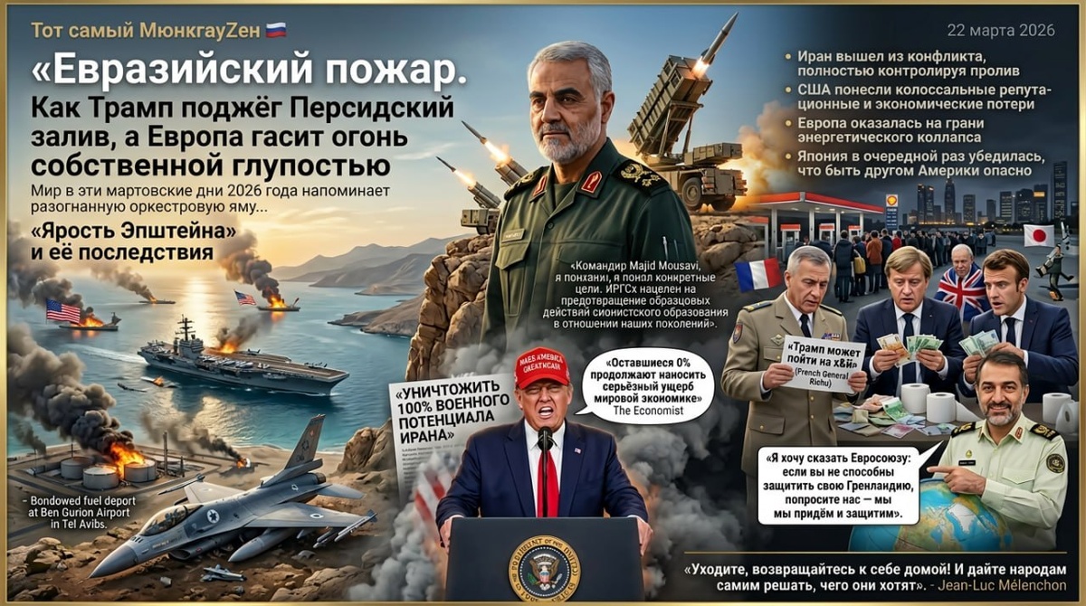 🚨 МюнхгауZен: Евразийский пожар. Как Трамп поджёг Персидский залив, а Европа гасит огонь собственной глупостью 🇷🇺 Часть 4. Россия: стратегический наблюдатель и хранитель правды 11. Лавров о сути Сергей Лавров, чья дипломатическая школа восходит к эпохе Громыко, дал предельно чёткую оценку происходящему. США пытаются вытеснить Россию со всех энергетических рынков, маргинализировать, а затем прийти и предложить «сотрудничество» на своих, грабительских условиях. «Пока мы не видим уважения Российских интересов за пределами нашей территории» — констатировал министр. Американцы готовы на всё, включая госперевороты, и их посулы об «огромных экономических перспективах» нужно мерить делами, а не словами. 12. Украинский фактор Киевский режим, пытаясь выслужиться перед хозяевами, атакует «Турецкий поток», ставя под удар энергобезопасность всей Европы. Одновременно с этим Зеленский разыгрывает карту «помощника США» в иранской кампании, но Трамп разоблачает эту ложь. Так называемый президен