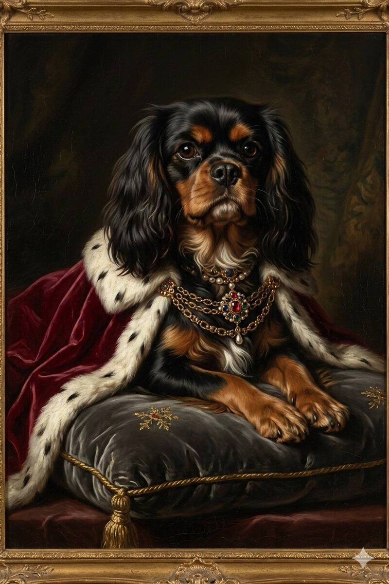 «Классический королевский портрет маслом, на котором изображена именно та собака, что на прикрепленном фото. Нейросеть должна идеально сохранить черты её морды и выражение глаз. Одеть собаку породы [ВПИШИТЕ ВАШУ ПОРОДУ, например: кавалер-кинг-чарльз-спаниель] в роскошную красную бархатную мантию с горностаевым мехом и массивное ожерелье с драгоценными камнями. Собака величественно лежит на серой бархатной подушке с золотыми кисточками. Темный, драматичный фон в стиле картин Ренессанса, шедевр живописи, высочайшая детализация».