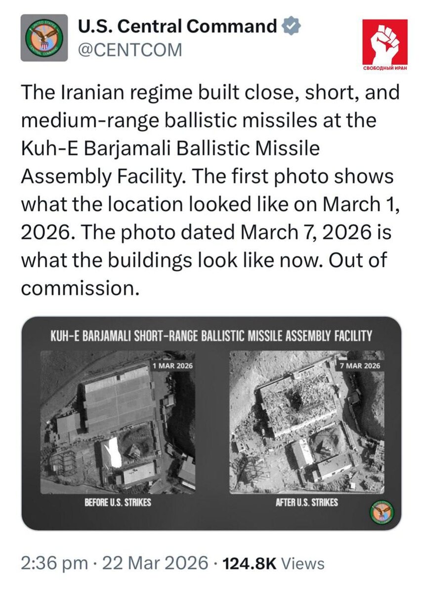 💥 CENTCOM показал снимки завода по выпуску баллистических ракет малой, средней и ближней дальности к востоку от Тегерана: до ударов от 1 марта и после них от 7 марта. По данным командования, объект теперь полностью неработоспособен. Подпишитесь на канал