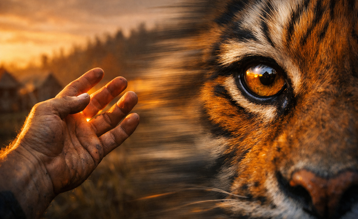 Когда всё было кончено, Егор откинулся назад. Он сидел на земле, мокрый от пота, и смотрел на тигра. Тигр лежал, положив голову на свои вытянутые лапы, и его дыхание стало медленным и глубоким. Глаза его были полуприкрыты. Он смотрел на Егора, и в этом взгляде не было больше ненависти. Там была усталость, благодарность и что-то ещё, что люди называют доверием, а звери называют — принятием чужой воли.
