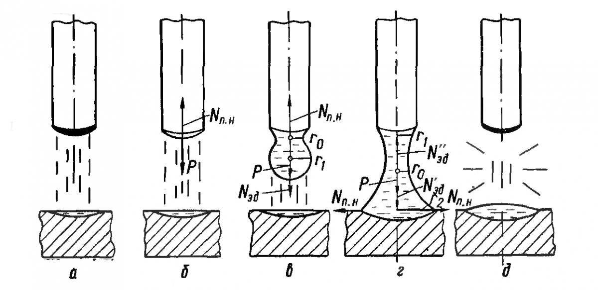 Вспомним старый пост. 👇👇👇 При переносе расплавленного металла действуют силы: 1 тяжести 2 поверхностного натяжения 3 электромагнитного поля 4 внутреннего давления газов Сила тяжести проявляется в стремлении капли под действием собственного веса переместиться вниз. При сварке и нижнем положении сила тяжести играет положительную роль при переносе капли в сварочную ванну; при сварке в вертикальном и особенно в потолочном положениях она затрудняет процесс переноса электродного металла. Сила поверхностного натяжения проявляется в стремлении жидкости уменьшить свою поверхность под действием молекулярных сил стремящихся придать ей такую форму, которая бы обладала минимальным запасом энергии. Такой формой является сфера. Поэтому сила поверхностного натяжения придает капле расплавленного металла форму шара и сохраняет эту форму до момента соприкосновения ее с поверхностью расплавленной ванны или отрыва капли от конца электрода без соприкосновения, после чего поверхностное на-тяжение мета