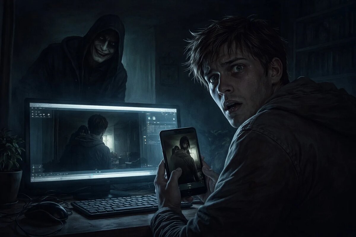 Внезапно телефон издал звук фотографирования. Игорь посмотрел на экран и замер: на снимке был он сам, стоящий рядом с монитором. И сзади… та же фигура в черном, улыбка всё шире.