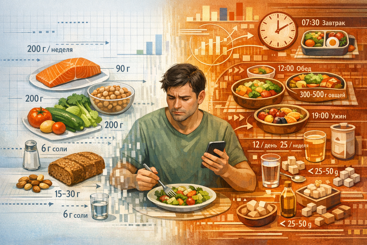 Да, помогает. Но только если человек умеет переводить цифры в обычную еду. Пока 300-500 граммов овощей для него это не абстракция, а, например, салат днем, суп или тушеные овощи вечером и что-то еще в запасе, цифра работает. Пока 15-30 граммов орехов это не математическая задача, а маленькая горсть, ориентир помогает. Пока 250 граммов бобовых в неделю превращаются в две понятные домашние ситуации, норма живет. Но если навыка перевода нет, число быстро перестает быть инструментом. Оно превращается в еще один способ почувствовать, что ты все время не дотягиваешь.